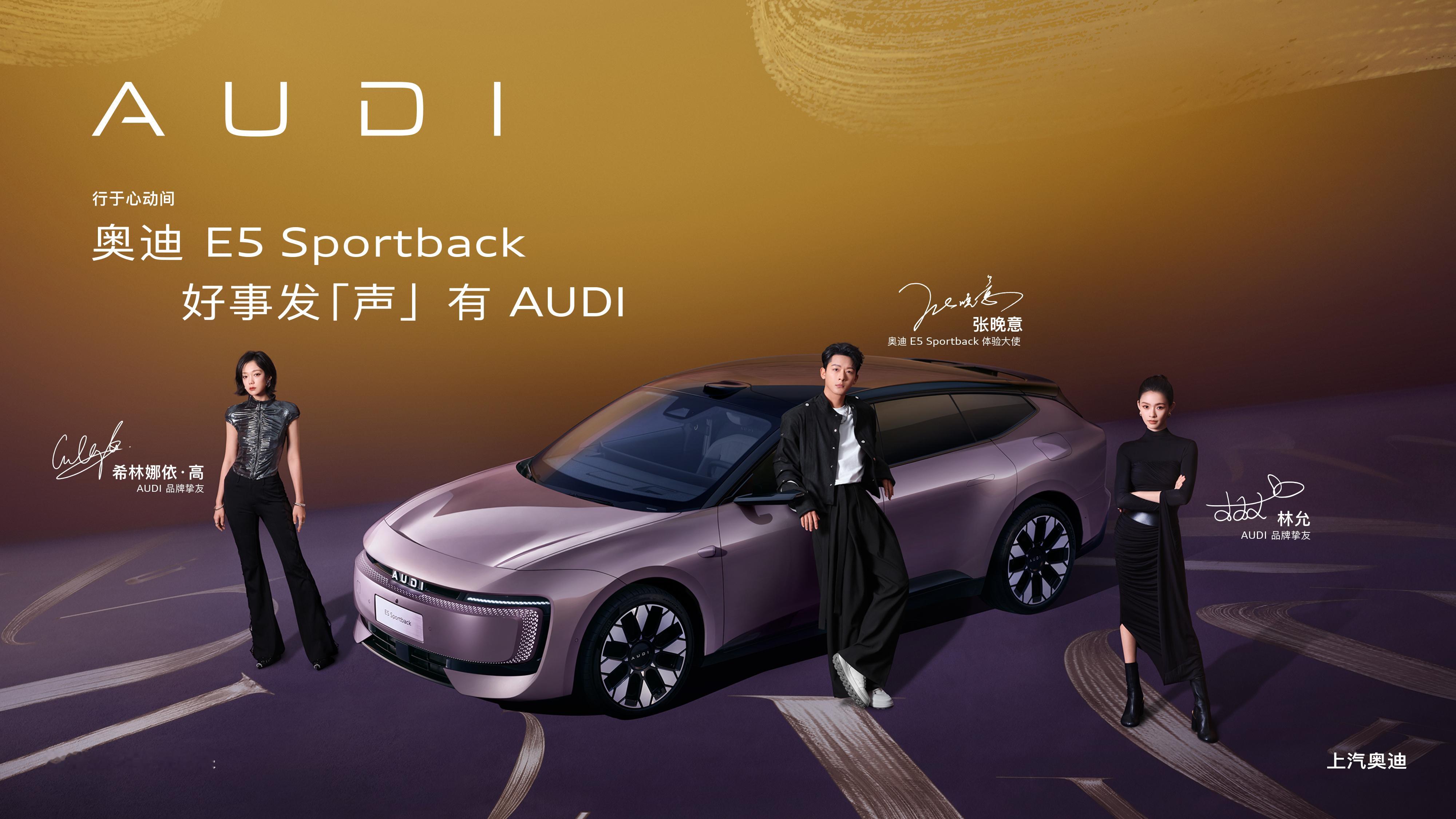 跟张晚意林允希林娜依高唱跳全场 张晚意、林允、希林娜依·高,三大明星与奥迪E5 Sportback一同奏响新年序曲,音乐美学碰撞数字科技。张晚意的沉稳适配车辆的精准驾控,林允的灵动解锁设计魅力,希林娜依·高的歌声呼应奥迪E5 Sportback的静音科技,三人同框很惊艳,还藏着对新AUDI年出行的美好祝福。