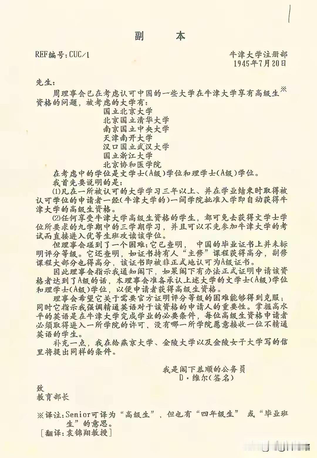 牛津大学1945年认定的中国七所顶尖大学,为何复旦、交大双双落选? 一张70多年前的旧文件,揭开了一段尘封的高教秘史! 近日,一份1945年牛津大学致中国教育部的信函原件曝光。信中明确承认北京大学、清华大学、浙江大学、中央大学、武汉大学、南开大学及北京协和医学院这七所高校的毕业生为“高级生”,可免试入读牛津。 然而,名单一出,令人大跌眼镜:如今声名赫赫的复旦大学和上海交通大学竟无一上榜!这究竟是为何? 据史料分析,当时的复旦大学刚由私立改为国立,学术水平在国内排名靠后。更因向夜校工人大量发放本科文凭,导致文凭含金量暴跌,声誉受损。而交通大学虽有一定实力,但在当时公认的“国立五大名校”面前,仍略逊一筹。 牛津的这一认定,不看学校出身,只看毕业生真实水平。这七所学校,代表了当时中国高等教育的真正顶尖力量。 历史的车轮滚滚向前,今天的复旦与交大早已今非昔比,成为国内顶尖、世界知名的高等学府。但回望这段历史,仍让人感慨:学术声誉的建立,绝非一日之功,而是数十年如一日的坚守与沉淀。 这份名单,不仅是对过去的记录,更是对今人的鞭策。 (信息来源:今日头条、牛津大学1945年档案文件)