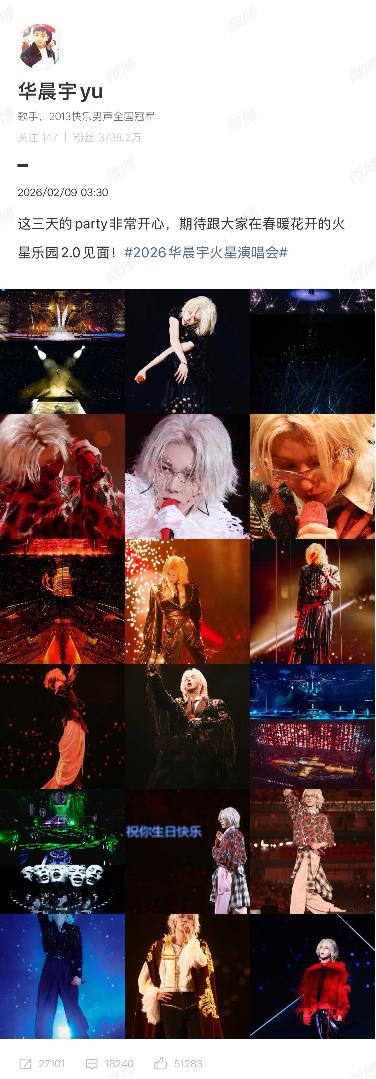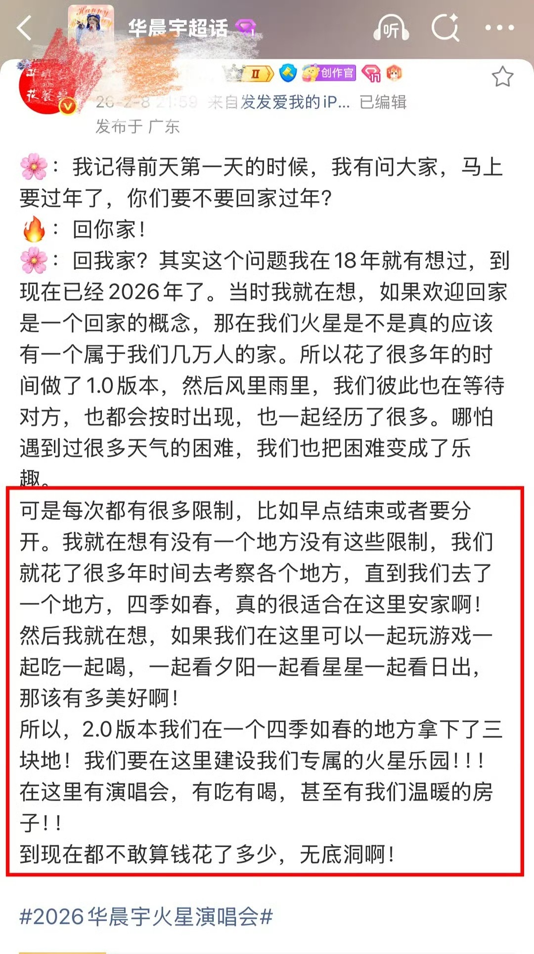 华晨宇拿下三块地华晨宇在2026年2月8日深圳火星演唱会收官站现场宣布,已在一个