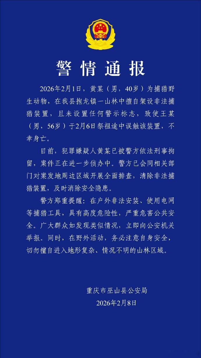 警方通报男子祭祖误触捕猎装置身亡 竟然在山上非法安装高危险性的电网,而且还没有任何警示,这种行为实在是危害公共安全。男子虽然被刑事拘留,但不知道会按照什么罪名判多少年,另一个人付出了生命代价是无论如何都弥补不了的。对山里这种危害性大的电网,一定要及时清理,否则很容易造成伤害。