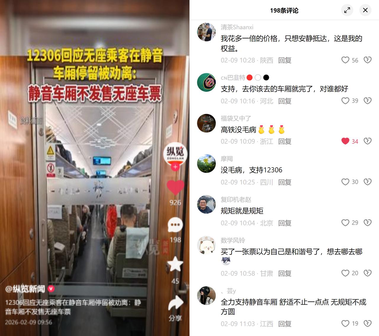 无座乘客进静音车厢被劝离 有人持高铁无座票,见普通车厢人多便站去静音车厢,即便自己没出声,还是被工作人员劝离。12306明确回应:静音车厢不发售无座车票,禁止无座乘客停留。 不少人误以为静音车厢是加价买安静,但它的票价跟普通二等座完全一样。这里的门槛并非金钱,重点在于购票时必须勾选同意的静音约定,保持安静、手机调至静音、接打电话或交谈需离开车厢等。 这事儿本质上是一场关于契约的博弈。那些选择静音车厢的乘客,是用自己的自律换来了相对安静的出行环境,这是他们和铁路、和彼此签下的隐形约定。无座票并未绑定这份契约,贸然进入,就等于破坏了他人用自觉兑换的权益。 规则存在的意义并非为了单纯约束,更多是在繁杂的公共空间里,给每个人的合理需求划好清晰的边界。你怎么看?