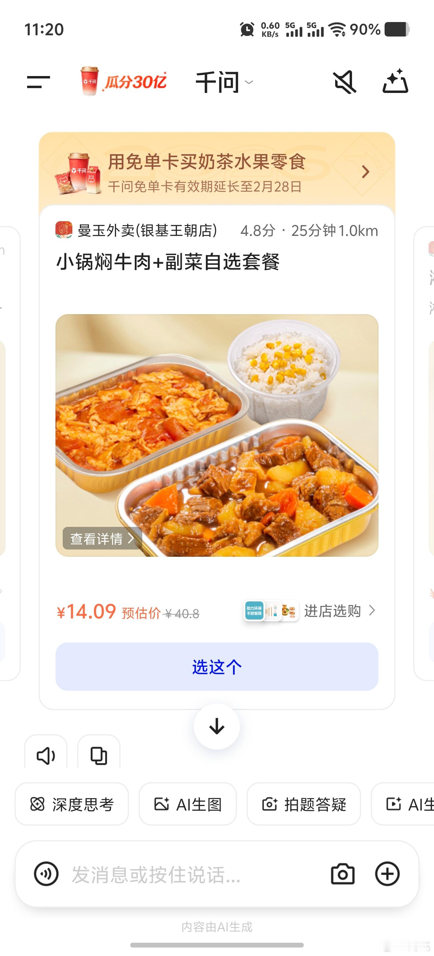 千问的霸王餐也是让我吃上了,不要钱的就是香!大伙都用千问点外卖了吗?分享截图到评