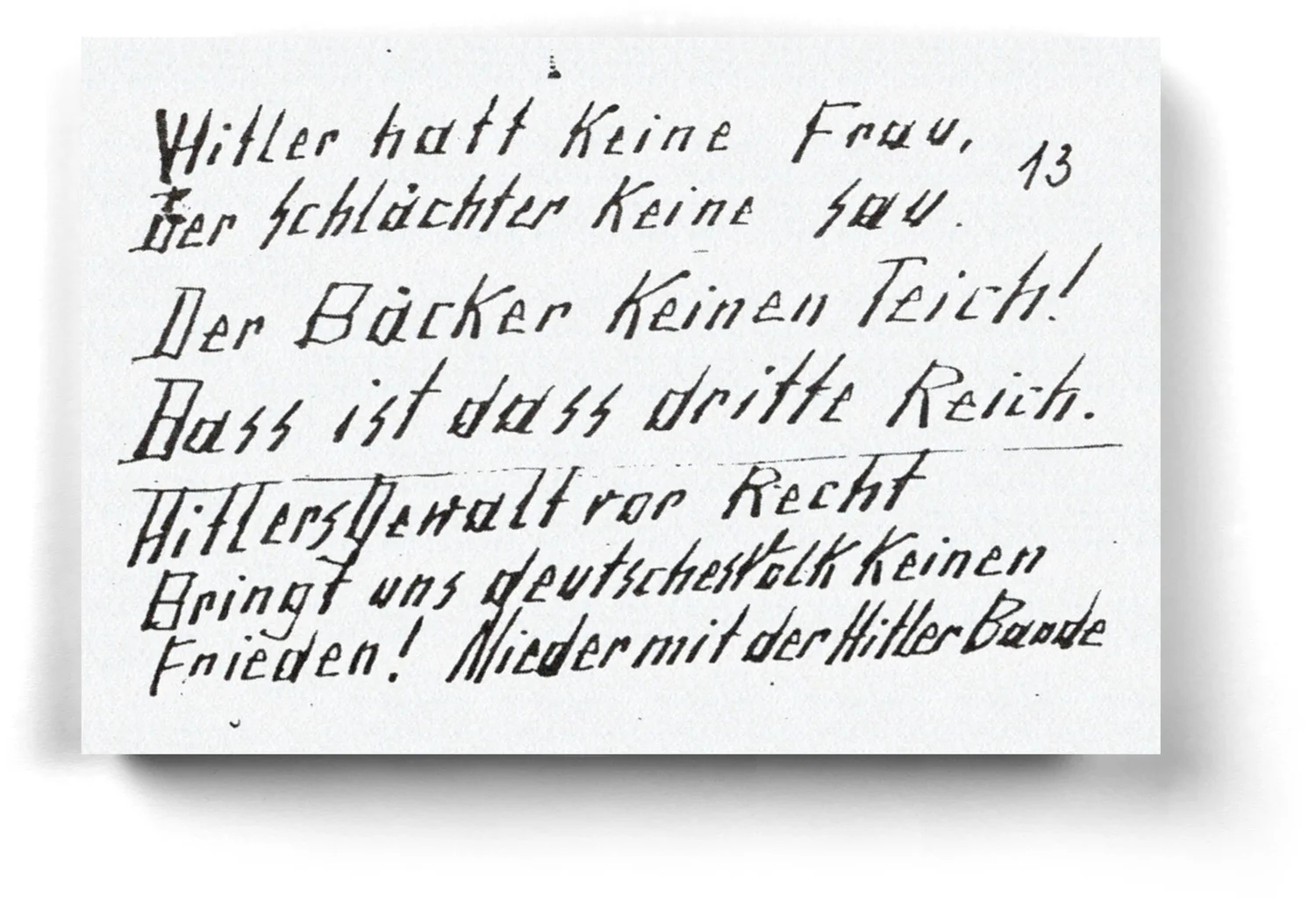 图1:被捕后的汉佩尔夫妇图2:位于柏林俩人故居的纪念牌图3:自由的新闻!看到的人请扩散!为什么要为希特勒的财阀而战斗、而送死!所有理智的德国人都应当帮助摧毁希特勒的战争机器!从而防止父亲与儿子被进一步屠杀!别卷工作,少生孩子!图4:希特勒没有妻子,屠夫没有猪!面包师没有面团!什么是第三帝国?希特勒的暴力统治给我们德国人民带不来和平!打倒希特勒匪帮!图5:一个德国男人:德意志人民,醒来吧!我们必须从希特勒那里解放出来!图6:希特勒的战争就是工人的死亡!照这样下去不行!绝不能与魔鬼般的希特勒政府讲和平!那九年来可耻的纳粹“制度”,必须被抛弃,并被确认为已被毁灭/清除!图7:自由的新闻!滚开吧,希特勒的愚民制度!卑鄙的上士希特勒和他的匪帮把我们拖向深渊!这帮希特勒—戈林—希姆莱的臭名昭著的匪帮,在我们德国只会带来死亡与毁灭!