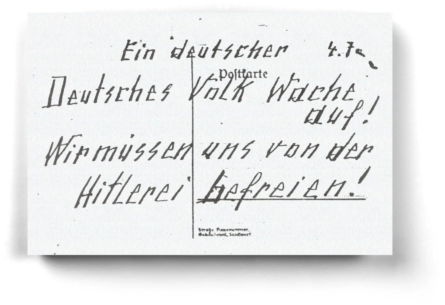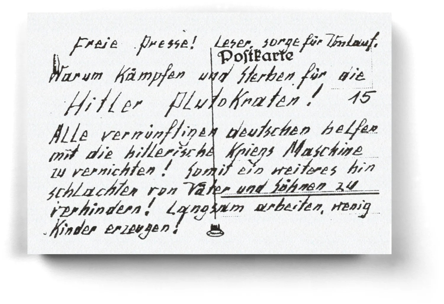 1940年,德军入侵法国期间,艾莉丝参军的哥哥在战争中身亡,这极大改变了这对夫妇对纳粹政府的态度。俩人开始写明信片,并将其散落在柏林的大街小巷和其他公共场所。明信片上的信息鼓励人们不要与政府合作,不要参军,也不要向纳粹组织(例如冬季救济会)捐款。在两年的时间里,他们总共撰写并散发了200多张明信片和传单。