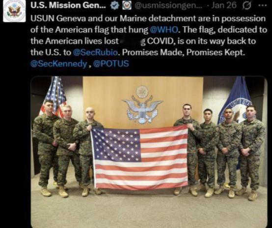 活久见!美国正式退出世界卫生组织后,世卫组织拒绝降下并归还悬挂在其门前的美国国旗,要求美国补交齐所欠的会费后才能归还。于是美国派出在瑞士的海军陆战队士兵直接去现场夺回了这面美国国旗。 2025年1月20日,特朗普刚重新住进白宫,连办公桌上的文件都没整理利索,就急急忙忙签了一道行政令,宣布美国要退出世界卫生组织。按照规矩,退出世卫必须提前一年通知联合国,所以美国正式退出的时间,定在了2026年1月22日。 美国嘴上喊得好听,说世卫组织应对新冠疫情不力,还缺乏改革和透明度,说白了就是觉得世卫组织不肯事事听它指挥,没法再借着这个国际平台谋私利、指手画脚,索性一拍桌子,摆出“老子不玩了”的架势。 可退出归退出,该尽的义务总不能一笔勾销。世卫组织的章程写得明明白白,成员国要退出,除了提前一年报备,还得结清所有拖欠的会费,一分都不能少。但美国向来不把国际规则当回事,2024年和2025年两个年度的世卫会费,它一分钱都没交,算下来一共欠了约2.6亿美元,换成人民币大概18亿元,可不是个小数目。 世卫组织也没惯着它,多次出面提醒催促,2026年1月17日,世卫组织发言人林德迈尔就明确表态,美国有退出的权利,但必须先缴清所有拖欠的会费,不然别想顺顺利利了断这段“成员国关系”。 美国正式退出后,世卫组织果然说到做到,不仅没降下总部门前悬挂的美国国旗,更没打算主动归还。在世卫组织看来,这笔拖欠的会费没结清,这面国旗就相当于“抵押品”,啥时候钱交齐了,啥时候再把国旗还给美国。 换做任何一个讲道理的国家,就算心里不乐意,也得坐下来协商沟通,可美国向来是唯我独尊,哪能咽得下这口气——自己想赖账,还被人拿国旗“拿捏”,这简直是打它的脸。 没等几天,美国就按捺不住动了手。2026年2月初,美国悄悄派出了驻扎在瑞士日内瓦美国领事馆的海军陆战队快速反应小队——这支小队本是负责外交安保的,说白了就是美国在日内瓦的“私人保镖”,可这次却压根没按规矩来,直接冲进了位于日内瓦的世卫组织总部大楼。 几个人动作麻利,二话不说就取下了悬挂在公共区域的美国国旗,全程神神秘秘,生怕被世卫组织的工作人员拦着。取下国旗后,他们没多停留一分钟,当天就乘坐军用运输机撤离了瑞士,连夜飞回了美国本土,活脱脱一场“速战速决”的抢夺行动。 事后,五角大楼还装模作样地出来解释,说这次行动只是“例行资产回收”,企图把这场抢夺说得冠冕堂皇。可明眼人都能看出来,这就是赤裸裸的耍横——一面国旗值不了几个钱,美国犯不着大动干戈派海军陆战队去抢,背后全是政治算计。 要知道,2026年美国要举行中期选举,特朗普阵营急着向选民表决心,证明他们推行的“美国不再为全球买单”不是逃避责任,而是“夺回国家主权”,这场抢旗大戏,就是一场零成本的政治表演,目的就是给赖账披上“爱国外衣”,拉拢选票、巩固自己的基本盘。 美国抢了国旗还不算完,反倒倒打一耙。2026年1月26日,美国驻华大使馆在微博上发布声明,公然控诉世卫组织背弃核心使命,屡次损害美国利益,还诋毁、践踏美国为世卫组织所做的一切,把自己塑造成了“受委屈的受害者”。 可事实上,美国作为世卫组织的创始成员国,本该承担起大国责任,可这些年除了拖欠会费,就是动辄以退群相威胁,从来没真正为全球公共卫生事业好好出力。 早在2020年5月,特朗普就曾宣布要退出世卫组织,后来拜登上台后撤销了这个决定,可2025年特朗普再次掌权,又立马重启了退群流程,这种反复无常的样子,早就没了一点大国该有的担当和体面。 其实这事也不是美国第一次干了,这些年美国的“退群”名单能列一长串:退出巴黎协定、退出伊核协议、退出中导条约,每次都是合则用、不合则弃,一旦国际组织不符合自己的利益,就立马翻脸不认人。 拖欠会费更是美国的家常便饭,截至2025年4月,美国光拖欠联合国的会费就超过10亿美元,差点让联合国陷入停摆危机,如今又把这套无赖手段原封不动地用在了世卫组织身上,一点都不觉得丢人。 说到底,美国抢的从来不是一面普通的国旗,而是想靠着这种蛮横无理的方式,向全世界宣告“我美国想怎样就怎样”,就算欠了账,也没人能管、没人敢管。可这种耍横赖账、无视规则的行为,只会让更多国家看清它的真面目,原来所谓的“美国优先”,不过是损人利己的霸道逻辑;所谓的“大国担当”,不过是它谋取私利的遮羞布。 世卫组织要求美国补交会费,本身就是合情合理的要求——世卫组织的日常运营、全球疫情防控、公共卫生援助,全靠各成员国的会费支撑,美国作为曾经的最大资助方,欠着钱跑路,本身就理亏,如今还派士兵抢国旗,更是把自己的无赖本性暴露得一览无余。