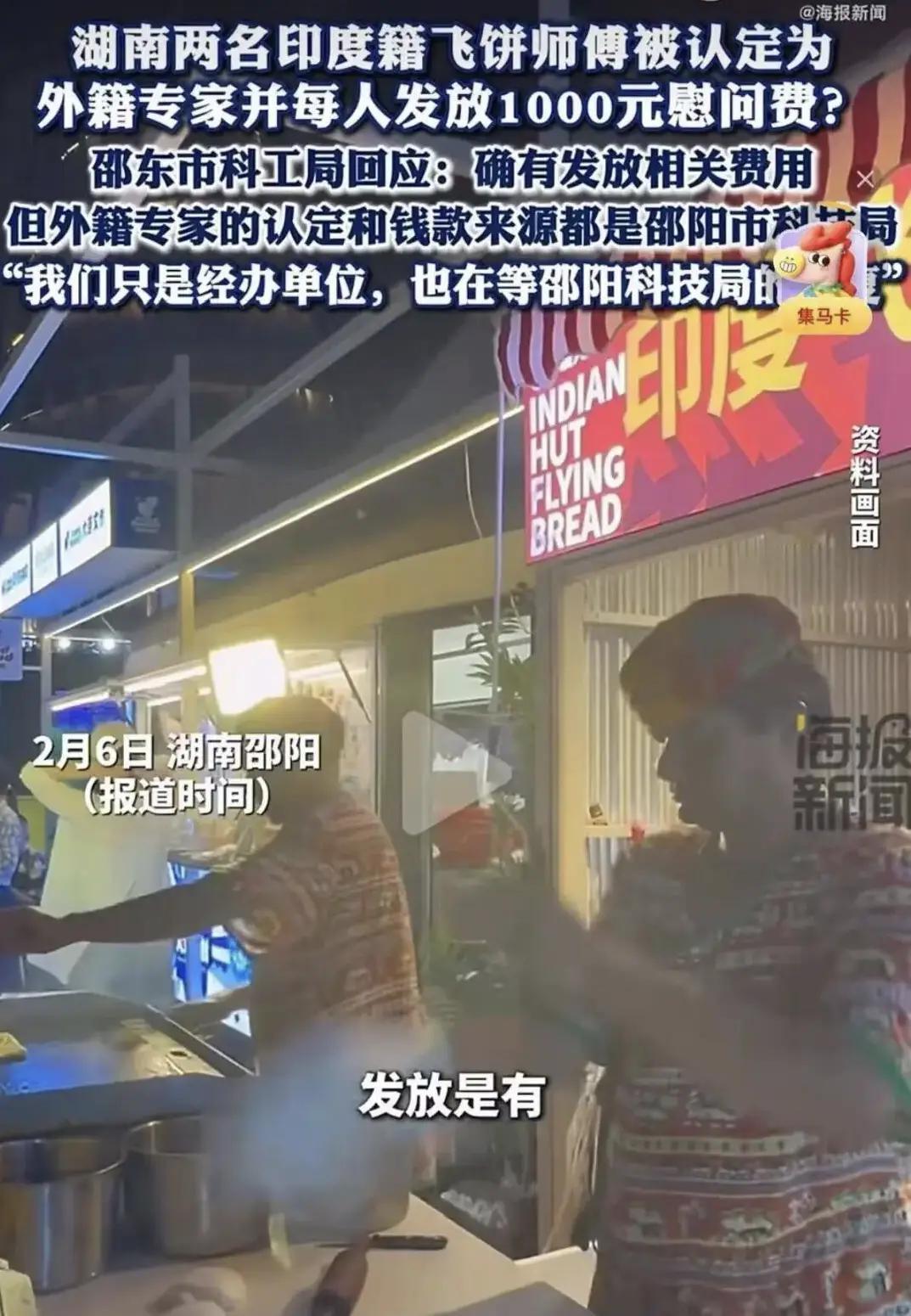 湖南邵阳出了个大事情,两个街头摊煎饼的印度师傅,摇身一变成了“外籍专家”,每人还领了1000块慰问金。 这两师傅是通过劳务中介招来的,就在街头摊位上做飞饼,20多块钱一份,生意还行。结果当地科技部门一顿操作,直接给人家扣上“专家”帽子。邵东市科工局说钱确实发了,但认定标准和钱从哪来都是邵阳市科技局的事儿,“我们只是经办单位”。记者打电话问邵阳市科技局,对方推脱说“等官方通报”。到现在,通报都没见着。 这事儿让我觉得最离谱的是双标。按湖南省自己的规定,外国专家得有大学学士学位和5年以上相关工作经历。你再看看这两位,街头摊煎饼的,很明显不符合相关规定。 更气人的是,这1000块是财政拨款,花的是纳税人的钱。你把这钱发给真正搞科研的、填补技术空白的外籍专家,谁也不说啥。可发给两个摊煎饼的,这不是糟践钱吗?我琢磨着,当地大概率是想搞个“国际化形象”,招商引资,优化营商环境…… 现在官方还没有给结论,还在踢皮球。公众的耐心是有限的,拖延只会让质疑愈演愈烈。 我就想问一句:你身边有没有这种“外来的和尚会念经”的荒唐事?