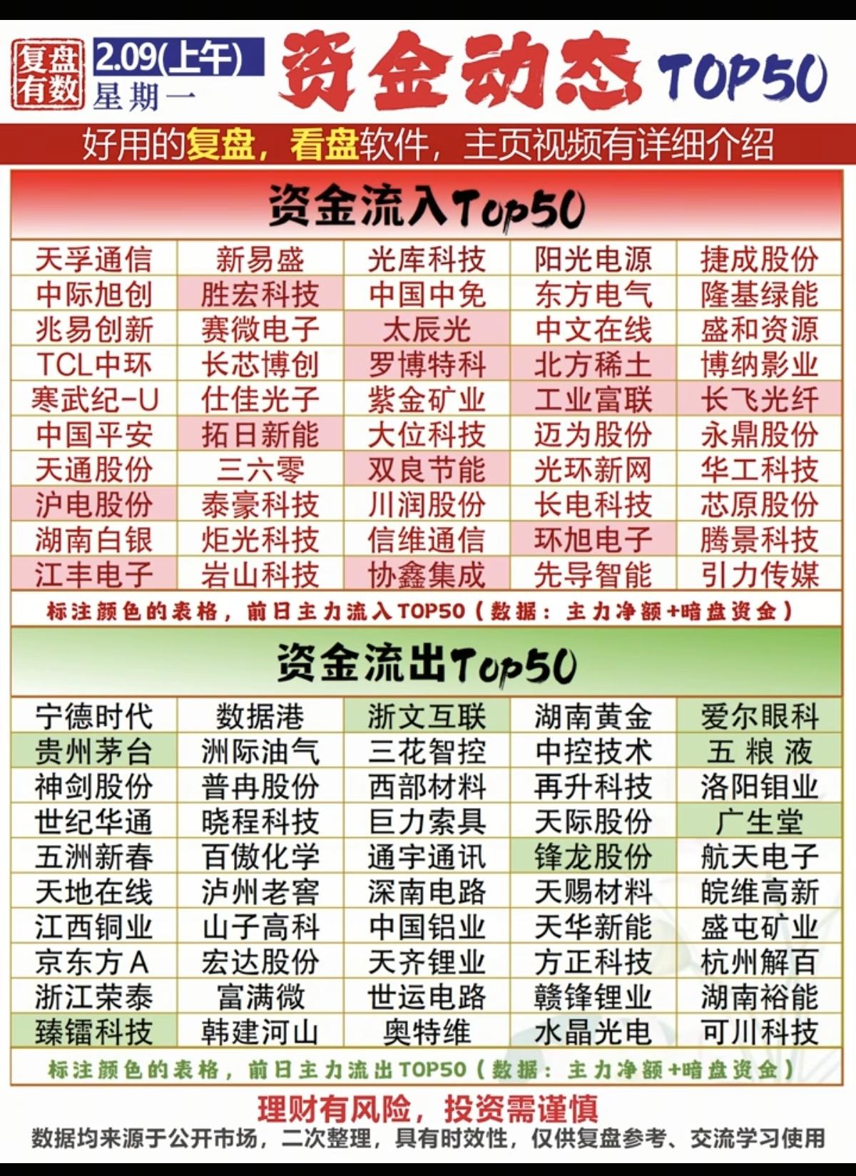 2.9周一 主力大资金 抢筹出逃个股榜! 资金抢筹: 光伏设备、文化传媒、AI应用、小金属、电子化学品、通信设备、玻璃玻纤等。 资金出逃: 采掘行业,燃气,商业百货等资金出逃