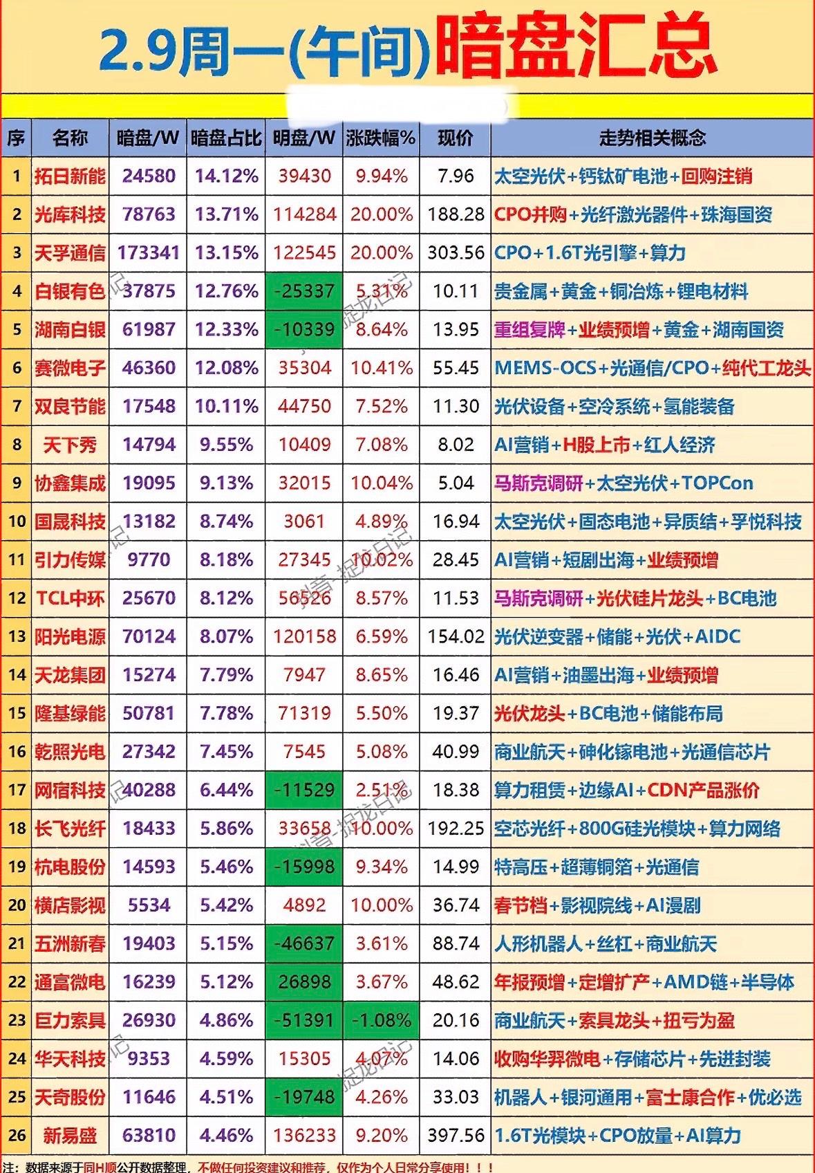 2月9日周一暗盘可太精彩了,暗盘股强势上涨,机会这不就来了嘛!协鑫集成稳居热门榜首,现价4.58元,挂单高达90.2亿,光伏设备、HIT电池、半导体概念集于一身,光伏行业本就发展迅猛,有政策扶持,它受关注也不意外。百川股份紧随其后,现价11.14元,挂单89.9亿,化学制品、光刻机(胶)、新能源汽车概念傍身。还有三变科技,现价25.41元,挂单78.7亿,电网设备、长三角、国企改革概念很吸睛。不过,挂单量大也意味着市场预期分歧可能大,大家抓住机会的同时可得多留个心眼。