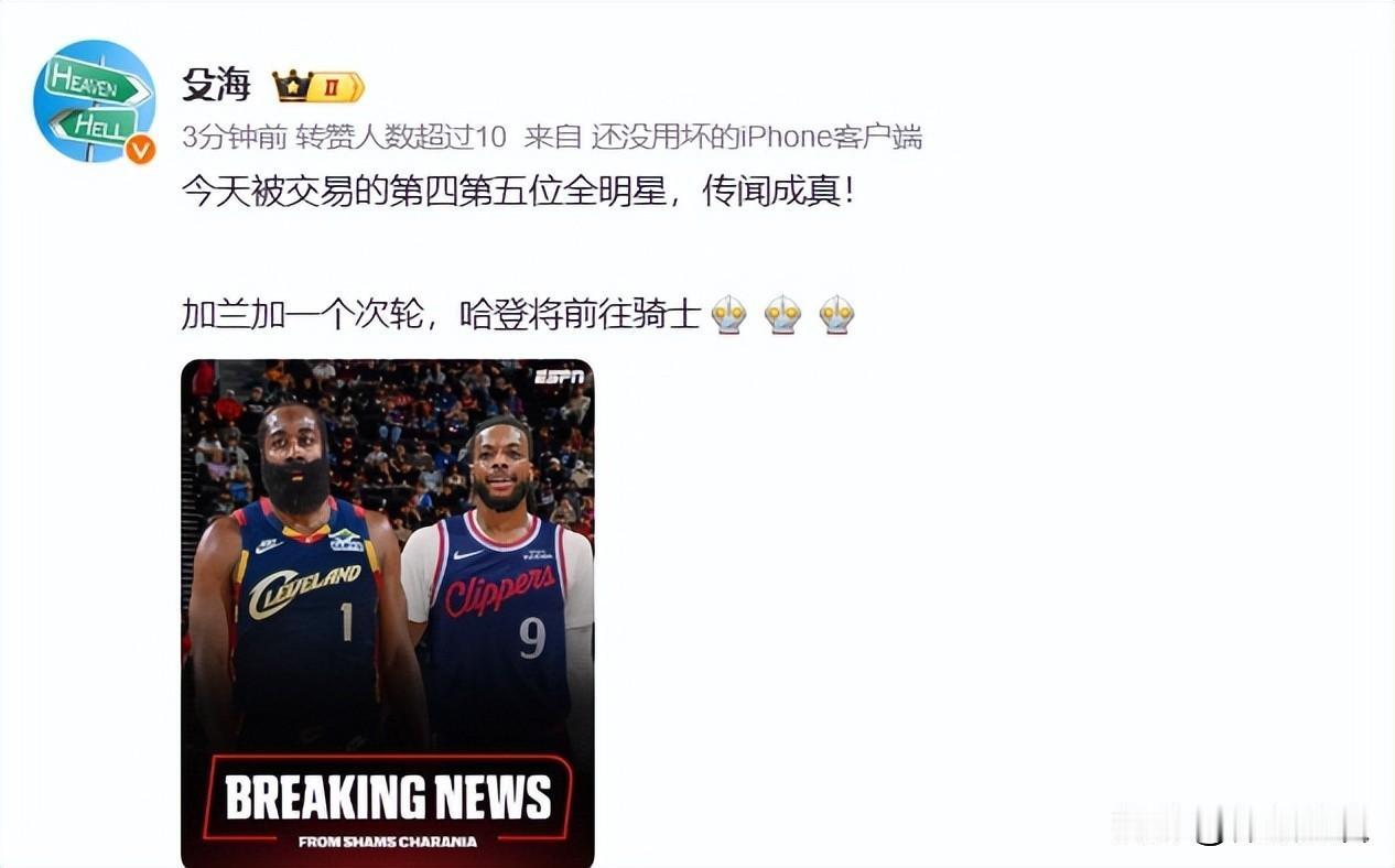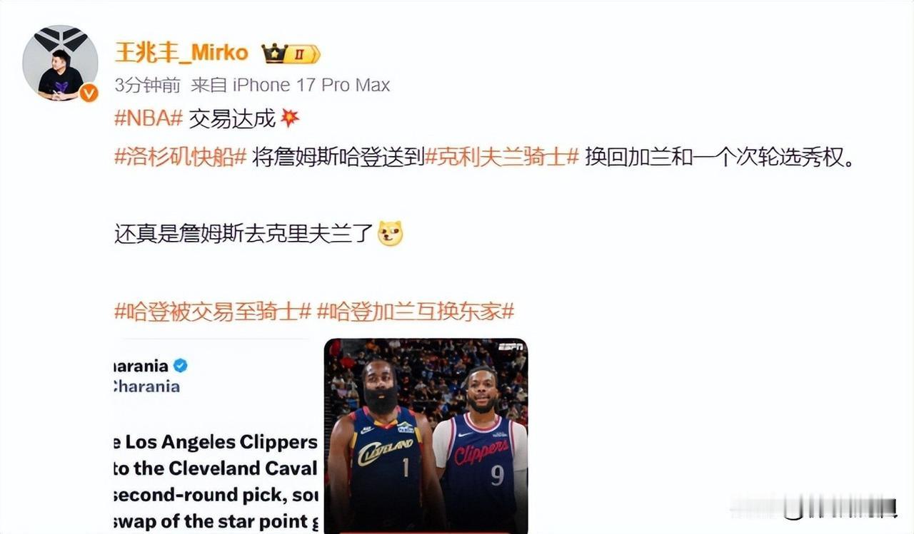 1换2大交易!哈登加盟骑士!国内名嘴热议,字母哥下家也浮出水面[送心] 就在几天前,NBA交易市场被一笔闪电交易引爆,詹姆斯·哈登的命运在24小时内改写,从洛杉矶快船队转投克利夫兰骑士队。 这笔交易的具体内容是,骑士队送出了26岁的全明星控卫达柳斯·加兰和一个2026年的次轮选秀权,从快船得到了这位36岁的传奇后卫。为了促成交易前往克利夫兰,哈登主动放弃了自己合同中的交易否决权,以及价值约236万美元的交易保证金。 这笔交易之所以迅速达成,背后是双方球队截然不同的战略考量。骑士队正处于“赢在当下”的模式,他们迫切希望说服球队核心多诺万·米切尔长期留队。 用未来换即战力,是一次明确的豪赌。而快船队在收到哈登团队提出的两年8000万美元续约要求后,选择了拒绝,并将目光投向了更远的未来。得到更年轻、伤病恢复后仍有潜力的加兰,符合他们重建的方向。 哈登的加盟,让骑士队的后场发生了质变。球队预计将排出哈登、米切尔、杰伦·泰森、埃文·莫布里和贾勒特·阿伦的首发阵容。上赛季豪取64胜的骑士,本赛季进攻效率出现下滑,哈登场均25.4分和8.1次助攻的顶级组织能力,正是他们急需的“解药”。 他的到来能将米切尔从过重的组织负担中解放出来,更专注于得分,同时也极有可能激活莫布里和阿伦这对内线双塔在挡拆中的巨大潜力。 对于哈登个人而言,这标志着他职业生涯晚期的又一次转折。在近六年里,他先后效力于火箭、篮网、76人、快船,如今骑士成为了他的第五站。尽管已荣誉等身,但总冠军戒指仍是唯一的追求,这次东游是他对冠军的又一次冲刺。 就在交易达成后不久,哈登在2月8日骑士对阵国王的比赛中迎来了首秀。他出战32分钟,高效拿下23分并送出8次助攻,与砍下35分的米切尔联手,帮助球队取得胜利。这场首秀初步展示了“登米”后场双枪的可怕火力。 骑士队被外界视为交易截止日的大赢家之一,他们不仅提升了即战力,还通过后续操作节省了约1亿美元的奢侈税。与此同时,交易市场上其他大鱼也各有归属,武切维奇加盟凯尔特人,小贾伦·杰克逊远赴犹他爵士,而扬尼斯·阿德托昆博则最终留在了雄鹿。 这次交易如同一块投入平静湖面的巨石,激起的涟漪远未平息。骑士的豪华纸面阵容能否转化为季后赛的深层胜利?36岁的哈登能否在克利夫兰找到职业生涯最完美的归宿?而失去核心组织者的快船,他们的重建之路又将走向何方?这一切都等待着时间给出答案。
