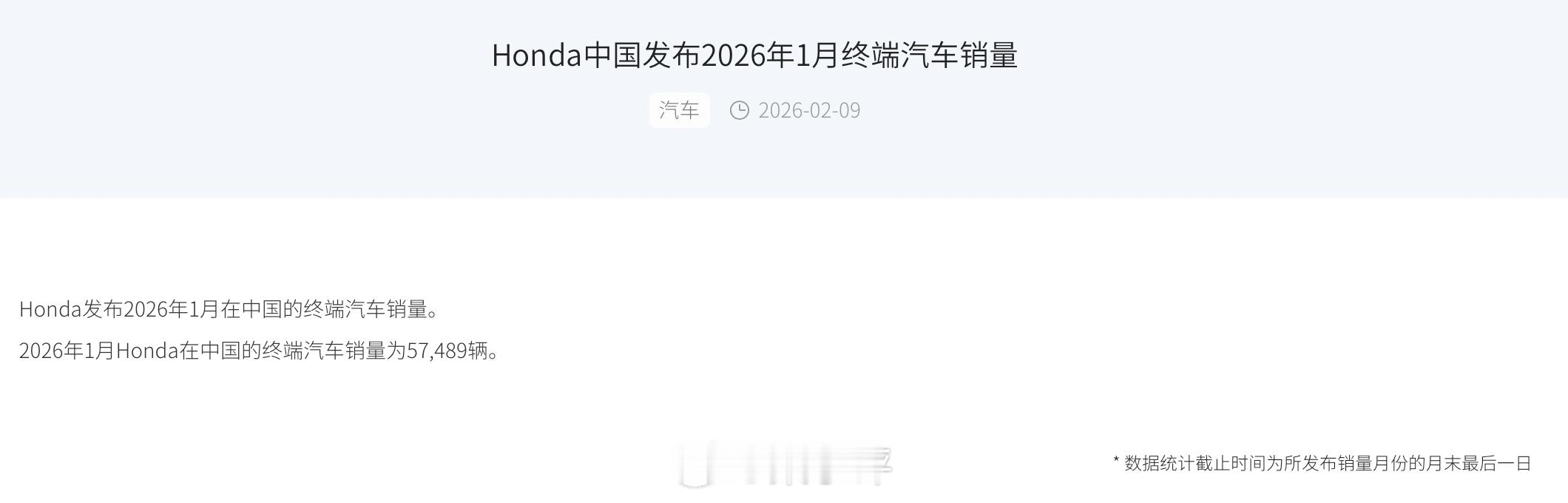 2026 年 1 月,本田中国市场的汽车销量为 57489 辆,同比下降 16.55%。