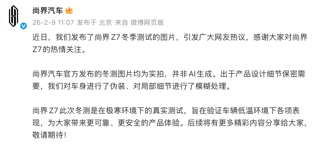 尚界汽车称冬测图片均为实拍尚界汽车辟谣冬测图片为AI生成官方公告来了,我还真是第一次听到“AI冬测”怎么想都不可能啊,看来尚界Z7这车真要大爆了