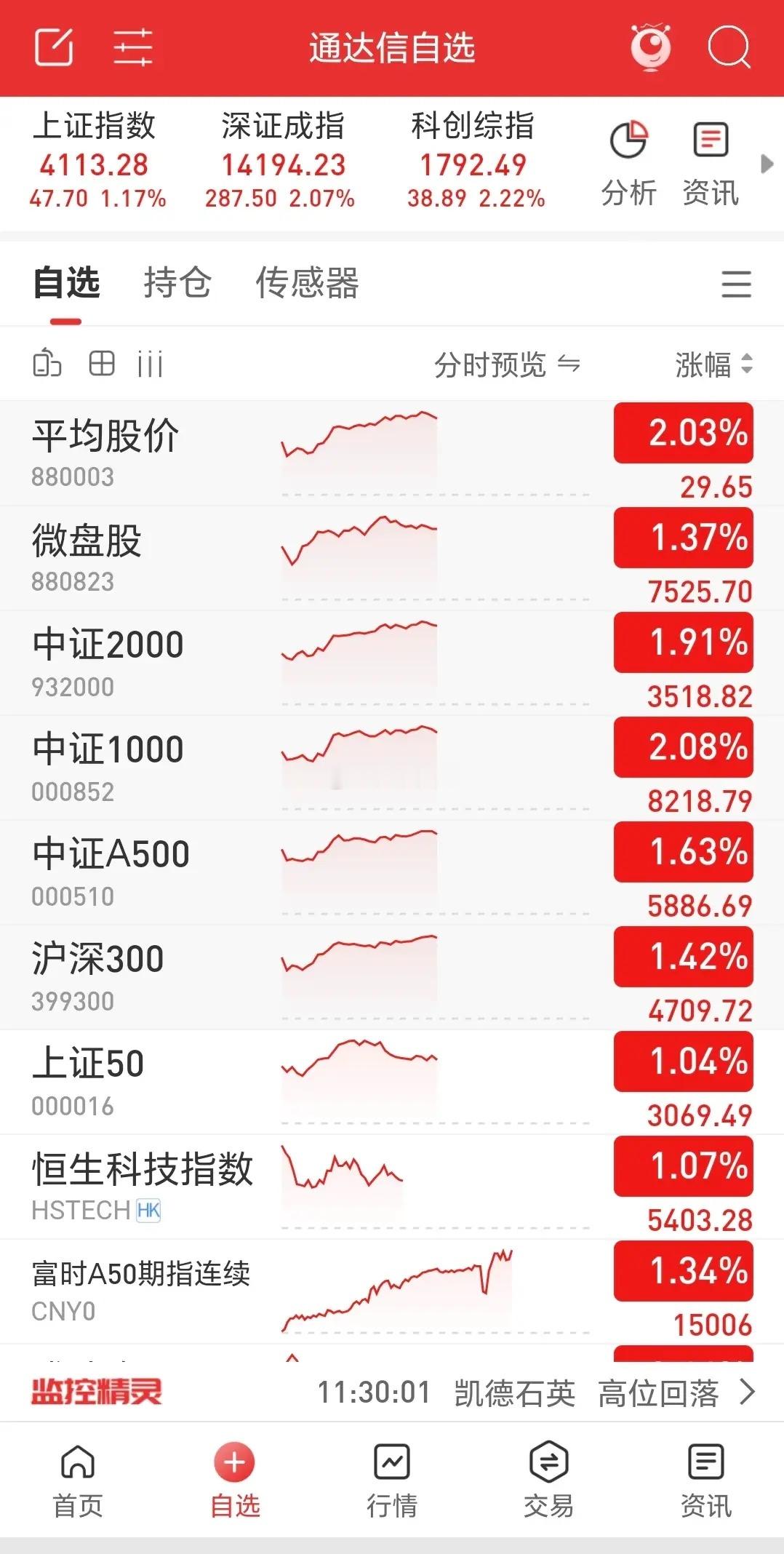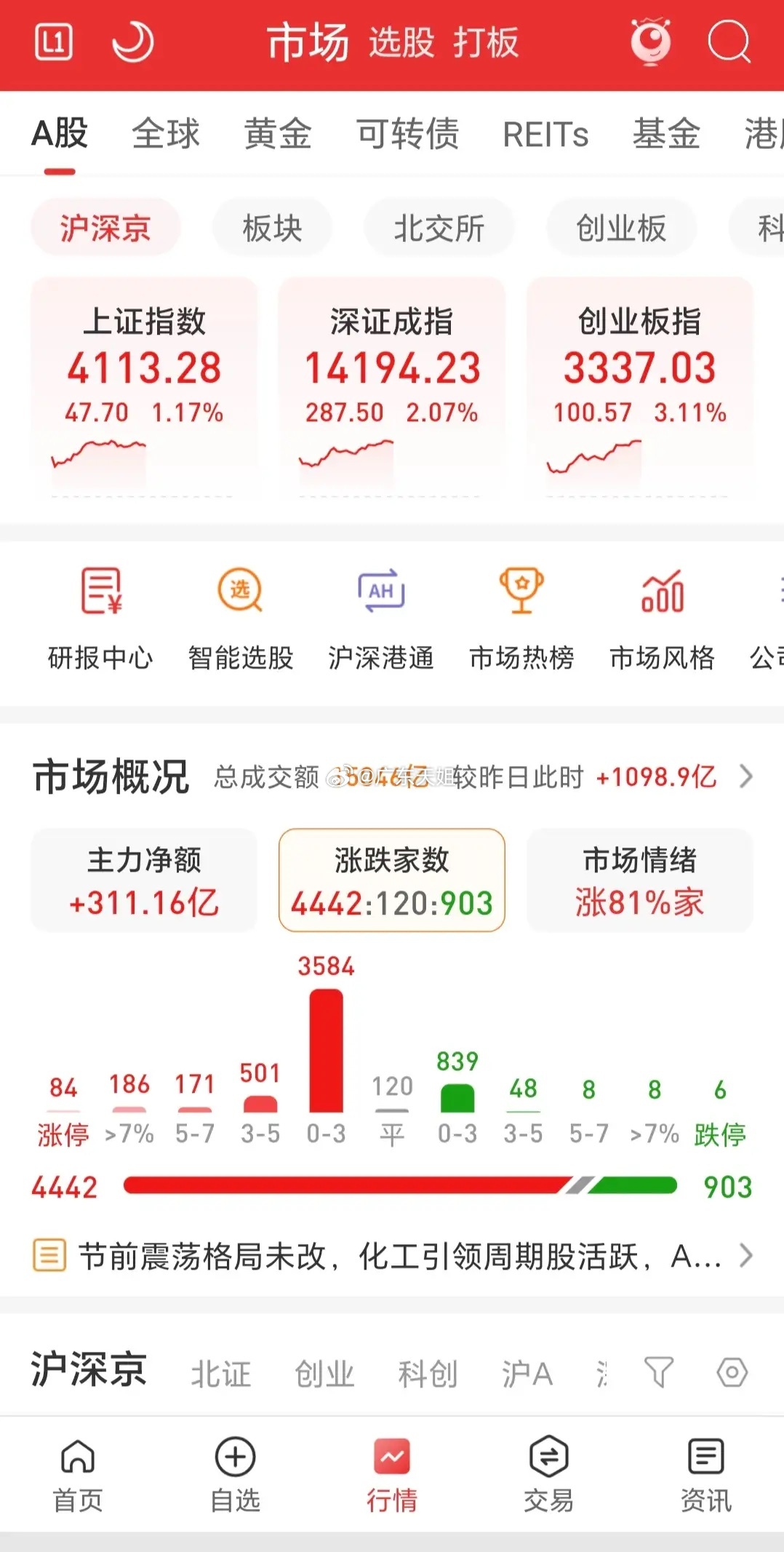 三大指数高开高走,市场成交量放大1100亿,涨跌比达5:1,市场情绪一片亢奋!