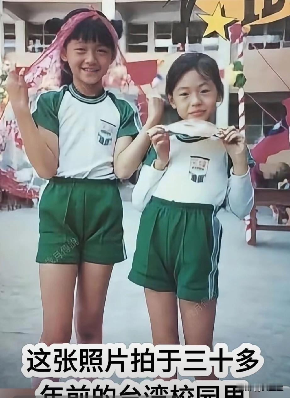 这张照片拍于三十多年前的台湾校园里,两个穿着同款校服的小女孩,一个活泼搞怪,一个恬静内敛。谁能想到,这对姐妹花日后会成为顶流,你知道她们是谁吗?