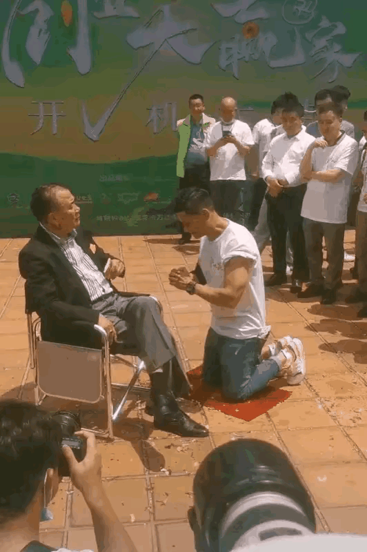 据说这是收徒弟时举行的仪式,这个当师傅的好像是手里拿件东西,向跪在地上徒弟的头上打了三下,也不知道这是在搞笑,还是在一本正经的收徒弟,除了小说上描写的一些收徒弟情节,现实中好像没有看过这样收徒弟的。也许这个师傅看西游记看多了,这是在效法孙悟空的师傅呢!可是孙悟空的师傅能够传授72变,不知道这个师傅有何看家的本事!