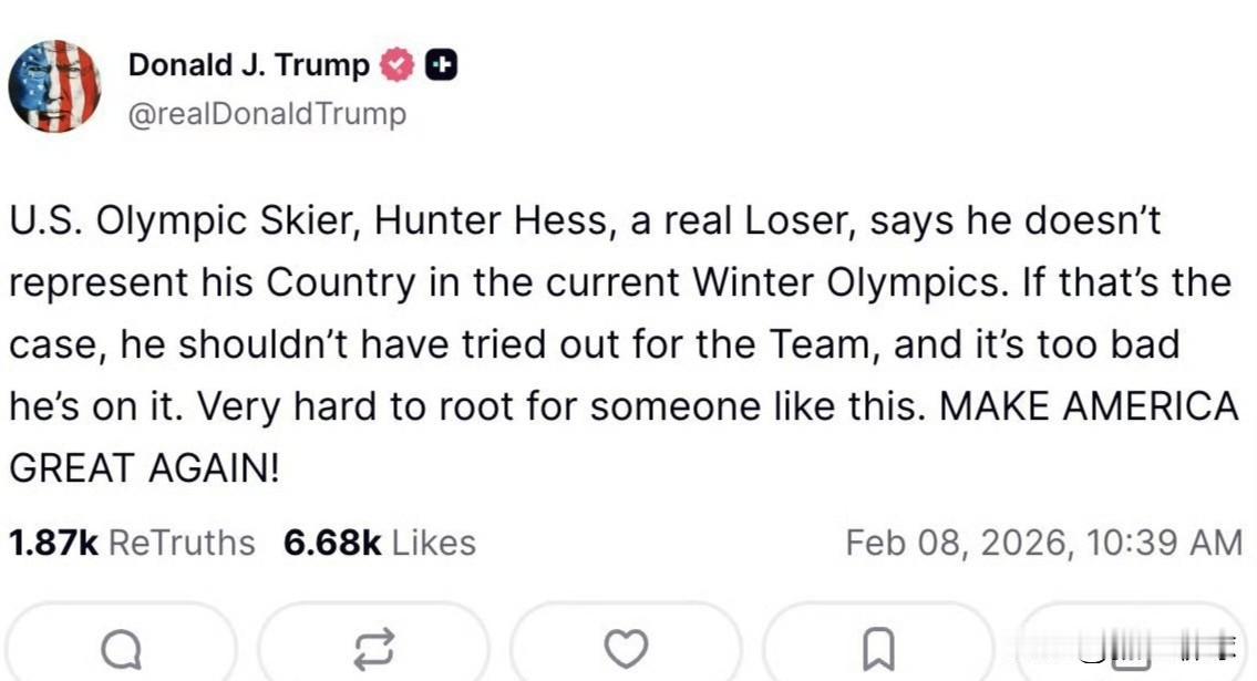 懂王”特朗普骂冬奥会美国参赛选手是“彻头彻尾的失败者” 代表美国出战本届冬奥会自由式滑雪男子U型场地技巧的亨特·赫斯(Hunter Hess,27岁)此前表示“代表美国参赛感觉有些困难和沉重”,引发总统唐纳德·特朗普强烈抨击,称其为“彻头彻尾的失败者”。美国国内的政治分歧正蔓延至奥运赛场。 据路透社等媒体9日报道,赫斯在上周末进行的访谈中坦言:“代表美国参赛让我感到有些复杂,情绪并不轻松。”他进一步解释道:“我并不是当前局势的坚定支持者,我相信很多人也和我有同感。我来参赛,是代表我的家乡、家人和朋友,以及我所认同的那些美国价值观。披上星条旗,并不意味着我就要为美国正在发生的一切背书,认同这个国家正在发生的一切。” 同场出席的队友克里斯·利利斯(Chris Lillis)也表达了类似立场:“我们相信每个人都应享有权利,公民应当以爱与尊重相待。我们希望透过奥运赛场上运动员的表现,向世界展现这样的美国。” 上述言论被解读为针对特朗普政府强硬移民政策的抗议。近期,美国明尼苏达州明尼阿波利斯市在移民海关执法局(ICE)打击非法移民以及强力镇压示威的过程中,发生了两名公民遭枪击身亡的事件。 特朗普总统在其社交平台上反击称:赫斯是个彻头彻尾的失败者,他说他在本届冬奥会上不代表自己的国家。 如果是这样的话,他就不该参加国家队的选拔,他留在队里真是太糟了。 很难为这样的人加油。让美国再次伟大!