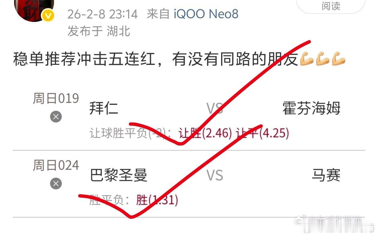昨日晚场稳单推荐五连红成功拿下,恭喜跟上的朋友们,最后四天过年前继续带朋友们吃肉