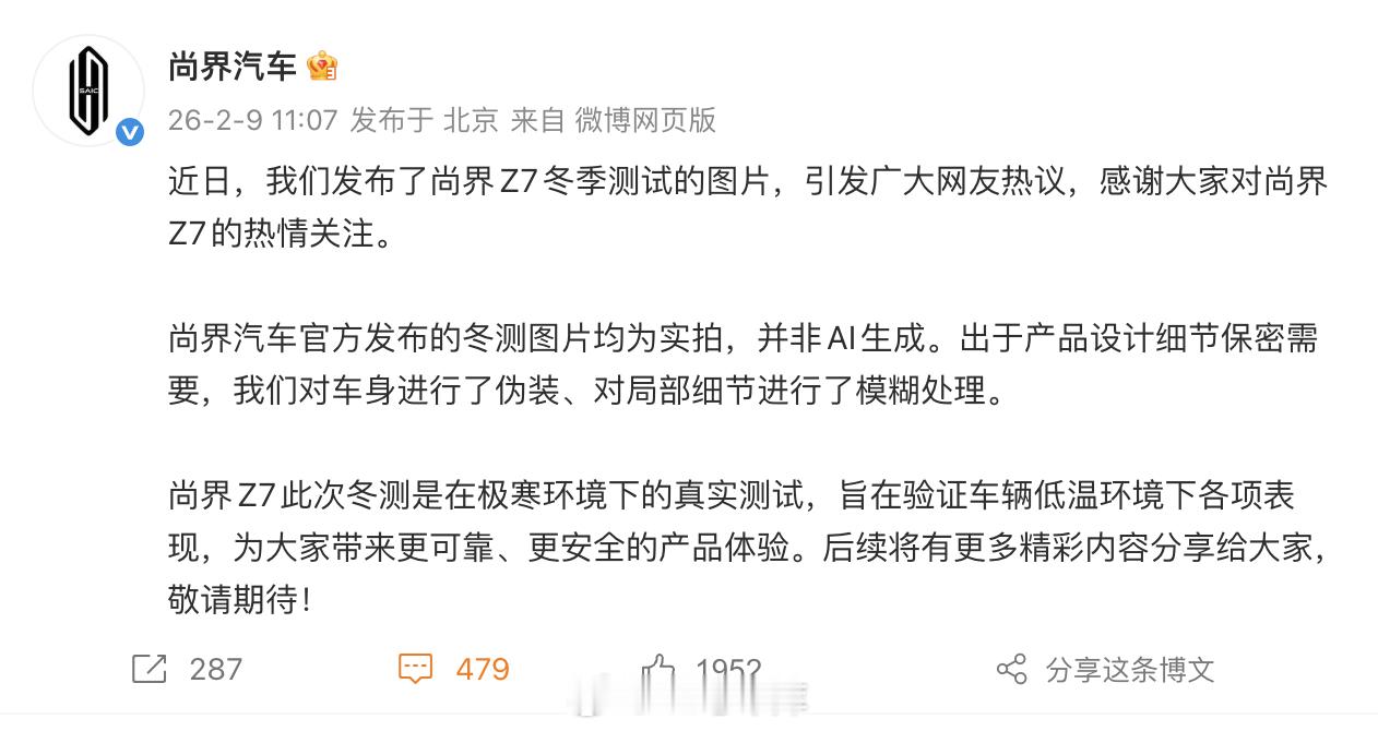 尚界 Z7 冬测引发的讨论,官方来辟谣了:冬测图片均为实拍,并非 AI 生成。出于产品设计细节保密需要,我们对车身进行了伪装、对局部细节进行了模糊处理。