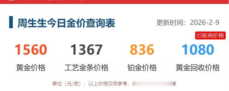 气温略有回升, 但是还是有点寒气。 中午雷打不动的去附近 购物中心,看看黄金价格。 2月9日, 周生生的黄金饰品价格为1560元, 比昨日的价格提高了15元; 工艺金条价格为1367元, 比昨日高了14元; 铂金价格为836元; 黄金的回收价格为1080元, 感觉这个回收太低了。 【周大金】新中式马上有钱小马项链女精美时尚百搭