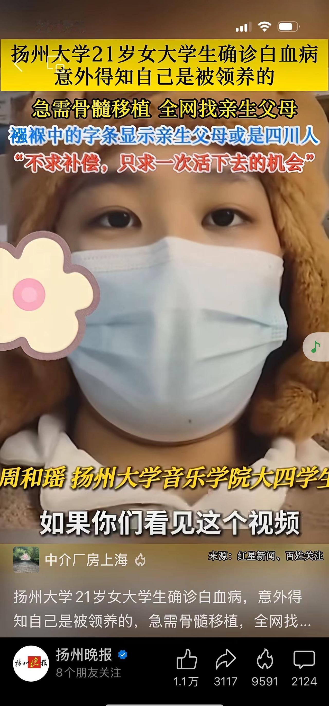 扬州大学21岁女大学生确诊白血病,意外得知自己是被领养的,急需骨髓移植,全网找亲生父母!“不求补偿,只求一次活下去的机会”热门 扬州 寻亲 白^_^^_^^_^这是个真实的事情