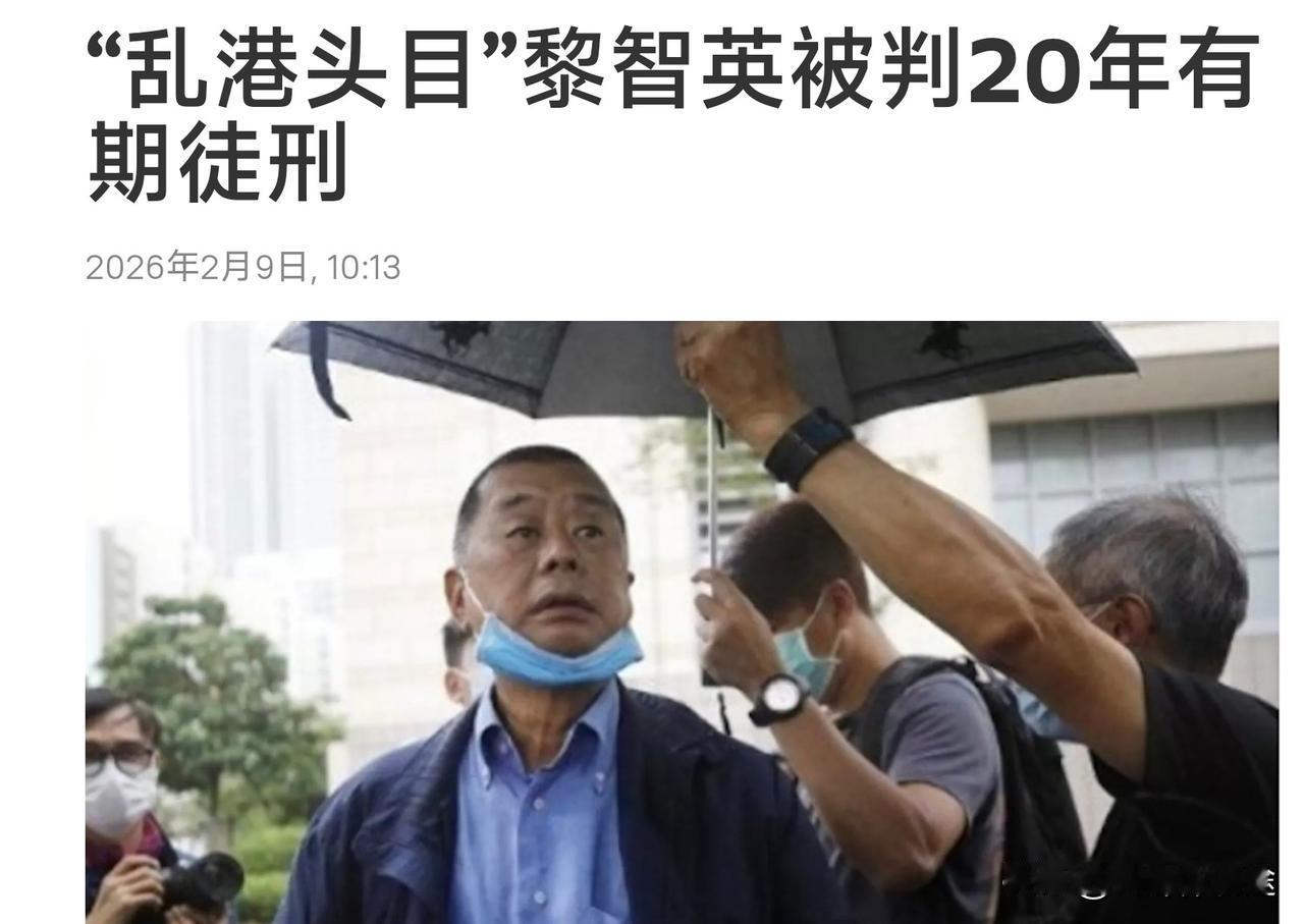 正义之锤落下,20 年牢狱,黎智英!这就是法治社会的正义力量!也表明任何外国势力企图破坏中国图谋失败! “乱港头目”迎来最终的判决,一切都终将落下,20 年有期徒刑就是对黎智英的 串谋勾结外国势力,串谋发布煽动刊物,危害国家安全的最终惩罚!历经 156 天的审理 以 20 年判罚入狱而结束了惩治乱港头目审判! 同时也表明了,任何国家 组织 个人 妄想在中国的领土做出危害中国安全的事情,也不可能得逞,就算外部势力再强再大,也无资格 也无能力 抵挡 14 亿中国人民的同心与意志力。 当然黎智英背后的外国势力 包括美国的 英国的 欧洲其它国家的,这些背后的亡我之心不死的行径一直在支持黎智英。就在 2025 年 12 月中国香港高等法院对黎智英案的罪名宣判成立之后,美国、英国、欧盟、澳洲等政客和组织立即跳出来,对案件横加指责: 1: 英国外相顾绮慧署名声明指“黎智英因和平地行使其言论自由,被中国及香港政府针对”、“呼吁撤销《国安法》及终结对所有个人的相关检控。” 2:美国国会及行政当局中国委员会说,“黎因从事新闻工作和支持民主被判有罪,呼吁无条件释放。” 3:美国“保护记者委员会”主管马丽怡指“黎智英唯一的罪行就是办报和捍卫民主”; 4: 欧盟对外事务部(EEAS)发声明称案件具有政治动机,要求立即无条件释放黎智英。 5: 一直收受西方政治组织捐款的NGO组织“无国界记者”亦发声明称:“《苹果日报》创办人体现出香港独立记者的勇气,而这项判决摧毁了他们仅存的任何空间。” 而这些西方国家的组织及团体更是搅乱世界的乱源之一,他们打着西方的民主与自由,公然干涉别人内政 公然组织反政府力量推翻别国政权,而其背后就是拿着美国“国际开发署”的钱 为美国办事,成为美国干涉别国内政的工具。而黎智英的背后美国的力量,也包括当下的美国政府。这一切乱源中的本质,就是美国等西方国家在政治上对抗中国的主要手段,以假民主 假自由 干涉中国内政,破坏中国的安稳 ,这才是黎智英背后的力量的根本目的。而黎智英已经成为美国等西方 国家的工具,20 年的牢狱也就是黎智英充当外国工具的“回报”!