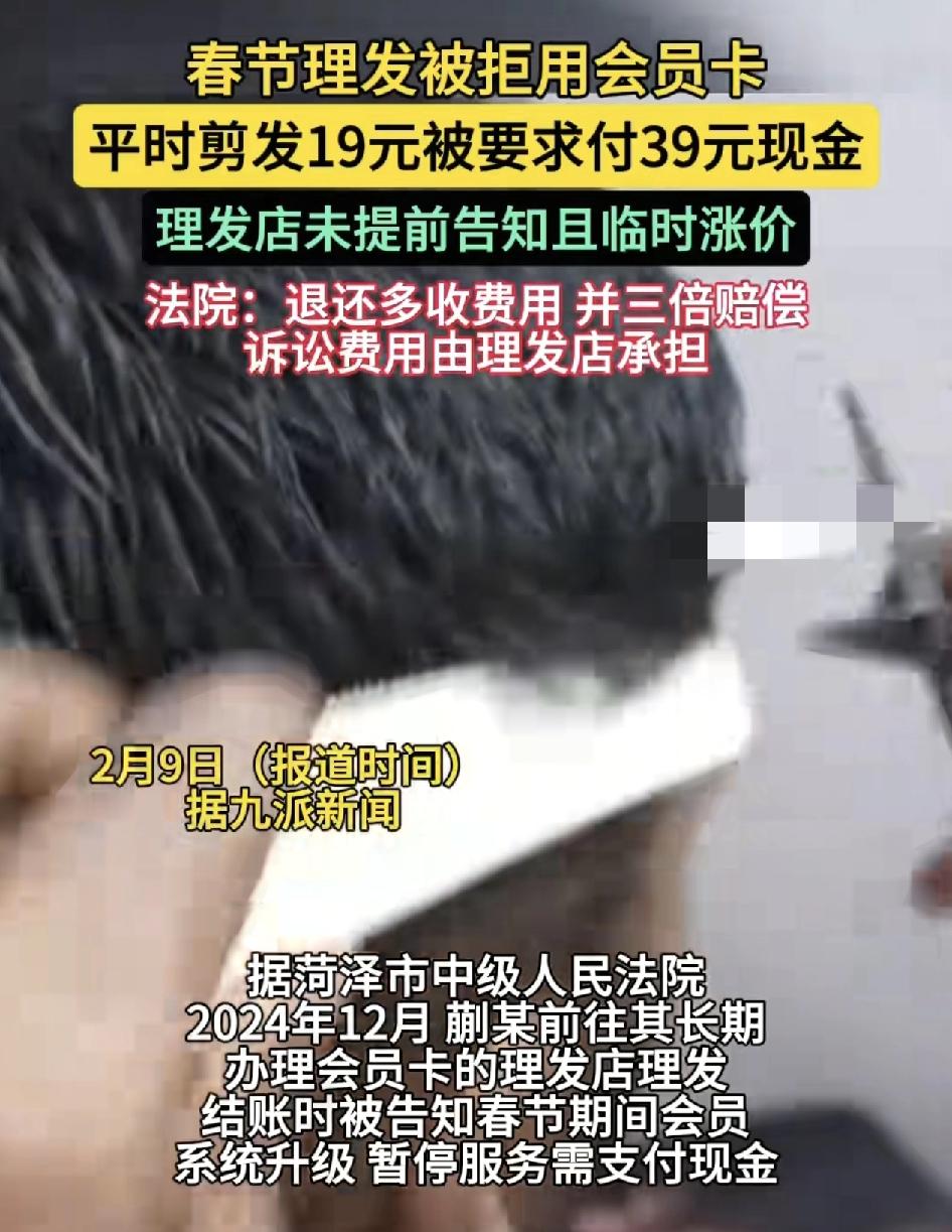 山东菏泽一男子在办理会员店的理发店理发师全面告知会员系统升级,需要支付现金,由于男子平时剪头发的会员价位是救援,但是却被临时告知39元。男子与店员协商未果。将理发店告至法院。经过调查,该理发店实际为人为暂停会员卡,并且并未提前告知,在春节期间金会员价格提升至200%造成了违约,不仅要退还给顾客。理发的费用,还要3倍赔偿,诉讼费用由理发店承担。