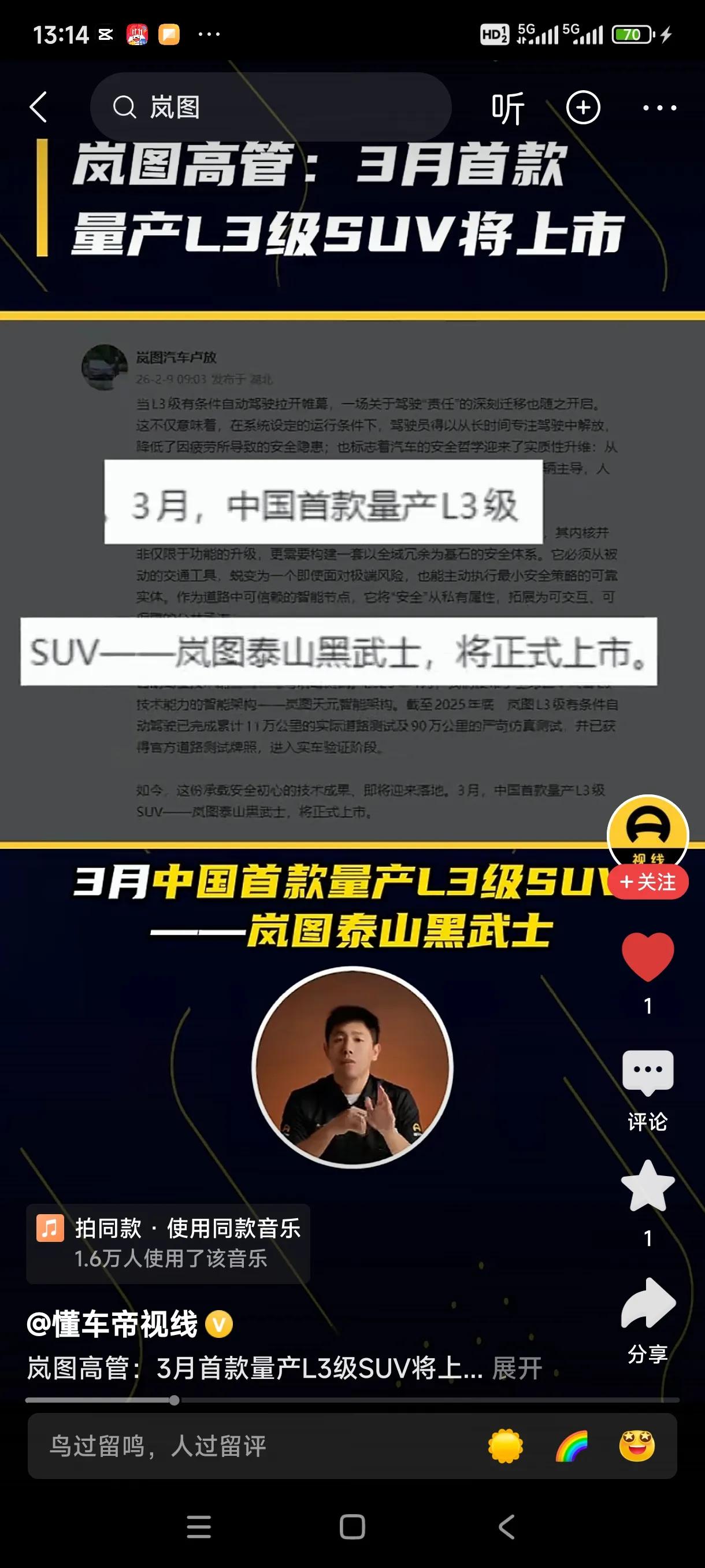 岚图汽车官宣,旗下插电混动大型SUV——岚图泰山黑武士版将于2026年3月限定上市,官方指导价50.99万元,定位品牌3.0阶段扛旗之作,主打L3级有条件自动驾驶与豪华配置 - 智驾:华为乾崑ADS 4,4颗激光雷达(前1+侧2+后1)+34颗传感器,超1000TOPS算力,L3级智驾能力;配6枚智驾状态“小蓝灯”,提升交互安全。 - 动力:超级插混,前后电机总功率380kW,百公里加速5.5秒;宁德时代65kWh 5C电池,CLTC纯电续航370km、综合续航1400km+;20%-80%充电约12分钟。 - 底盘:三腔空气悬架+后轮转向,兼顾舒适与操控。 - 外观:全车黑化+专属套件,高亮黑格栅、22英寸黑色锻造轮毂、红色卡钳 。 - 内饰:专属打孔纹理、刺绣头枕、星空顶,强化豪华感 。 上市与定位 - 上市时间:2026年3月,限定发售。 - 竞品:问界M9、腾势N9、极氪9X、理想L9等。 - 意义:岚图冲击高端新能源市场的旗舰,L3智驾量产落地关键车型。
