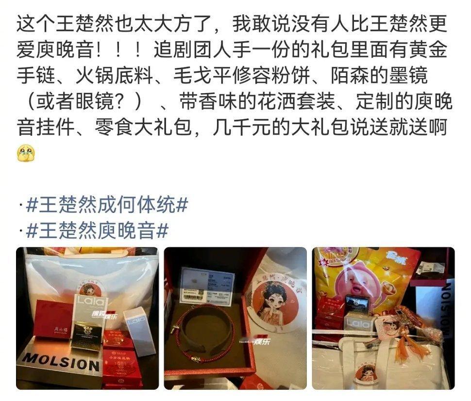 王楚然追剧团送了黄金+毛戈平粉饼+陌森眼镜等一堆东西 好大方