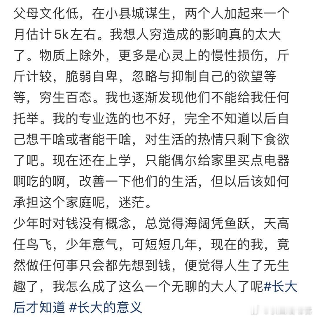 用户10xxx58 1 2026-02-09 16:29 你的家庭条件比我好太多了,但是我大学过得比你好太多了。大学学费用的助学贷款,生活费没跟家里要1分钱,靠课余和周末兼职。学期末在拿个奖学金助学金。每年都能和同学一起出去旅游几次。大三(2012年)要做毕业设计了,自己买了台笔记本,5000多吧。毕业时手里还存了1万来块钱。父母不欠你任何事情,怨天尤人只是显得你懦弱无能。