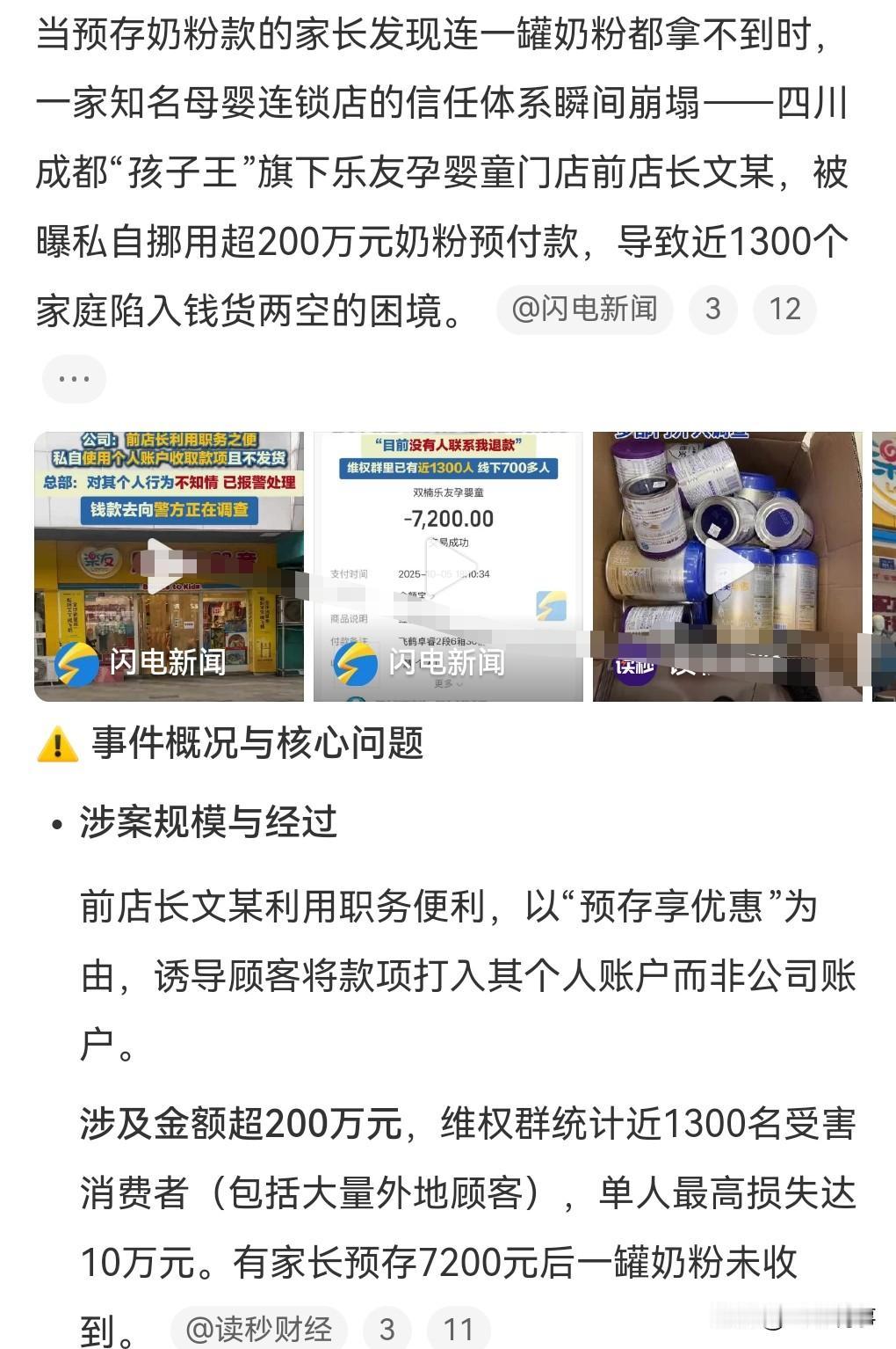人千万不要有作死的行为,不作死就不会死。 千万不要贪污,这是一条绝路,如果被抓到了,那绝对是要坐牢的。 还是要多想想后果,要知道自由比金钱重要太多了。 近日四川成都有多人反映,很多家长预付了奶粉款,却没有收到货。 原来是那个店长是收了200万货款不发货。 警方已经立案调查了,一定要抓住这个店长,我相信他也跑不了。