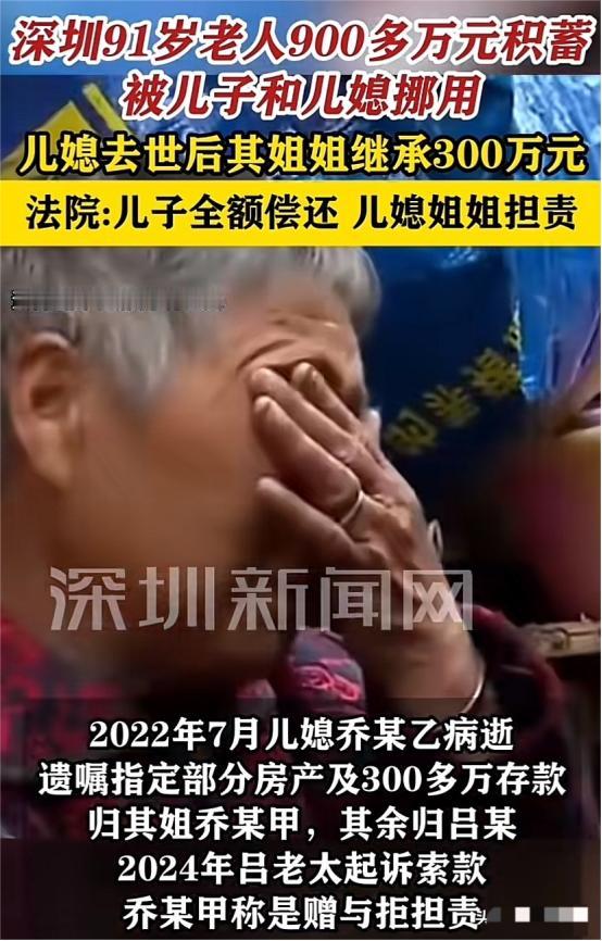 “不要低估人性!”广东深圳,9旬老人想着自己年事已高,行动不便,膝下也只有一个儿子,便把900余万元存款全部转给儿子,怎料,儿子事后又把钱转给儿媳,儿媳拿这些钱支付日常开销、偿还房贷、装修房子也就罢了,在去世前还留下遗嘱指定自己的姐姐继承其中的300万元以及房子50%的产权。老人知道后,愤怒不已,以借款为由,一纸诉状将儿子以及儿媳的姐姐告上法庭,要求儿子以及儿媳的姐姐退钱,老人儿媳的姐姐则认为老人转给儿子儿媳的钱不是借款,也不是保管,而是赠与,老人无权索回。法院这样判! 这起案件最让人不能理解的地方就在于,儿子为何要联合一个外人,骗自己老母亲的钱? 事情还要从2018年说起。当时老太太年近90,,想着把钱交给自己唯一的儿子吕某。那是她毕生的积蓄:包括出售北京房产所得在内的900余万元,老人统统毫不犹豫的转到吕某名下,并嘱咐:“这钱你替我管着,以后看病、请护工都靠它。” 可儿子没签任何协议,也没设专用账户,而是直接把钱和夫妻共同账户混在一起。更糟的是,他和妻子乔某直接把这笔钱当成了“自己的”:不仅用来还房贷、装修、甚至连旅游购物,全都从里面出。 而老太太对此毫不知情,一直以为钱好好地“存着”。直到乔某突然病逝,一份遗嘱曝光,才揭开真相。 乔某竟然把老太太的积蓄指定给自己的亲姐姐继承,其中包括300万元和房产一半产权。那一刻,老太太既愤怒又心寒,她没想到自己的亲儿子竟然联合外人骗自己,只能打官司讨说法。 法庭上,乔某姐姐坚称这是赠与,但法院没买这个账。试想一下,900多万对一个九旬老人来说,就是命根子。 如果连这钱都能被当成“赠与”,那老人晚年怎么办?更何况,老太太明确说是“保管”,不是送,那么这钱就不应该被用于夫妻共同生活。 最终,法院判决吕某必须全部归还,而乔某的姐姐因继承了妹妹的遗产,也需要承担还款责任。 这个结果再次明确了一个信息:父母的钱永远属于父母,子女可以代为保管,但没有擅自处置的权利。哪怕是一家人,金钱往来也需要清晰的边界和起码的尊重。 如今,案子虽然判了,但信任没了、亲情散了、老人家的心也彻底凉了。或许老人从一开始计较的就不是钱,而是那份“我在你心里还有位置”的安心。 对此你有什么看法?欢迎在评论区留言讨论。遗产继承 父母养老 信息来源: 深圳新闻网 文|墨海 编辑|史叔