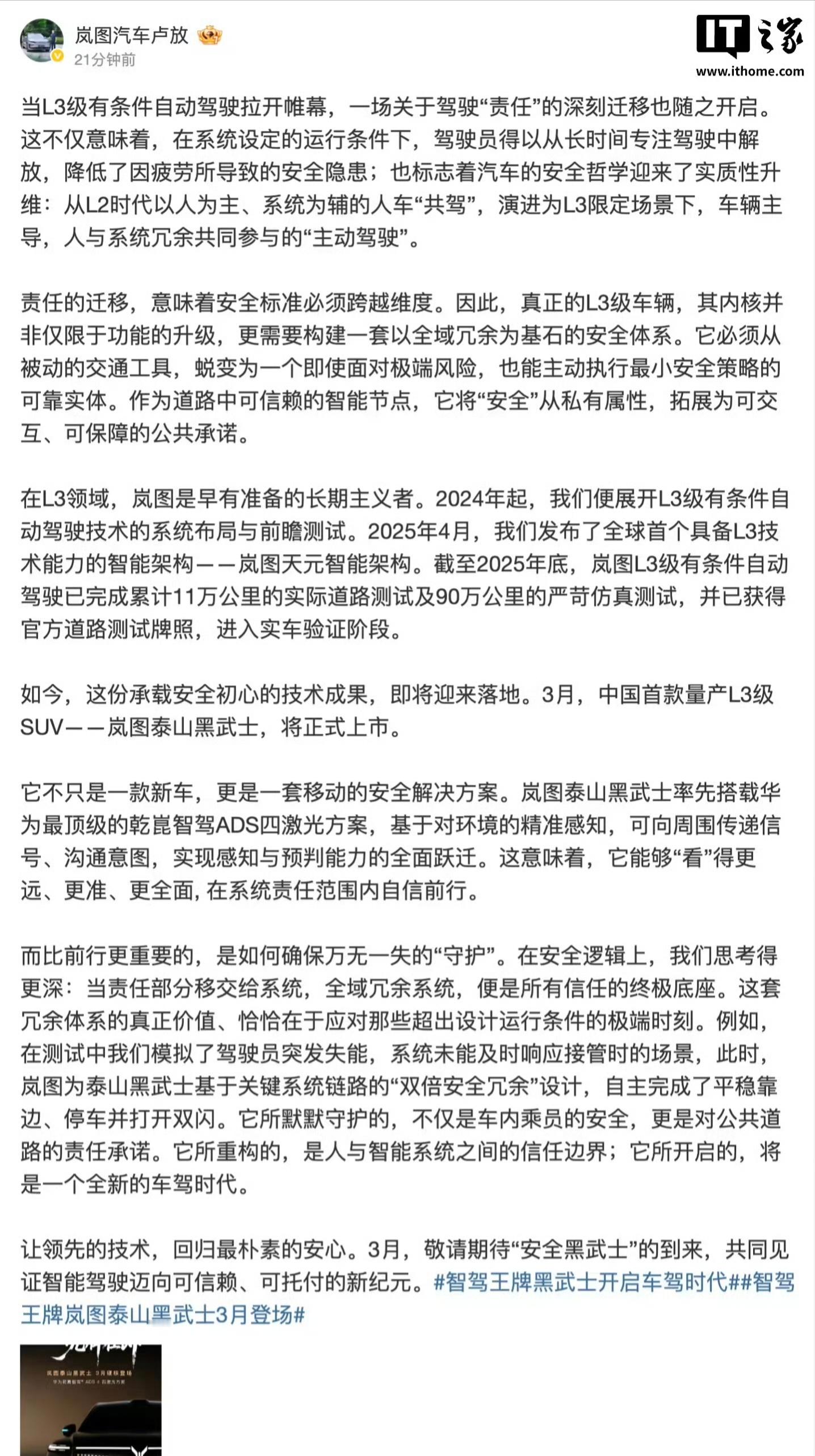 中国首款量产L3级SUV将上市炸锅消息,岚图汽车官宣,中国首款量产L3级SUV——泰山黑武士,3月就要上市了!从2024年开始布局,到现在已经跑完11万公里实路+90万公里仿真测试,官方牌照也稳稳拿下!它搭载华为乾崑智驾ADS 4四激光方案,看得又远又准,连暴雨大雾都不慌。最狠的是全域冗余安全系统,就算司机突发状况,车也能自己平稳靠边停车,安全感直接焊死在车里。这不仅是一辆车,更是把“安全”做成了公共承诺!从L2的“人为主、系统为辅”,直接进化到L3的“车辆主导、人与系统冗余共驾”,智驾时代真的要变天了!