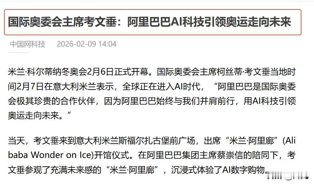国际奥委会再次投出信任票,中国已经站在了技术输出端! 看到新闻,就在米兰冬奥会开幕之后的第二天,国际奥委会主席考文垂就当面致谢了阿里巴巴集团主席蔡崇信,她表示是:“阿里巴巴AI科技引领奥运走向未来。” 说起来,这并非考文垂第一次与阿里管理层会面。几个月前,考文垂到访阿里全球总部,就与阿里CEO吴泳铭进行了AI方面的探讨。 那么阿里做了什么,让这位去年新上任的国际奥委会主席如此重视?大家应该知道,今年的米兰冬奥已基于阿里云千问打造了奥运百年历史上首个官方大模型。不得不说,中国AI这波反向输出,真的太提气了。 事实上,不只是这次的米兰冬奥会,这些年阿里一直在推动奥运会的技术变革. 比如东京奥运会,首次用上了阿里云打造的奥林匹克广播服务公司转播云;还有2022年的北京冬奥会,直接实现核心系统100%上云,成为百年奥运首个云上奥运,包括短道速滑、冰壶比赛的多视角观赛体验,背后都有阿里云的技术身影。 前国际奥委会主席巴赫说过:“如果没有阿里巴巴,就不会有奥运人工智能”。能得到这样的高度认可,可见阿里的技术实力,早就得到了国际奥委会的认可。 可能有人好奇,这阿里云千问会在米兰冬奥会上发挥什么作用? 其中不得不提的就是阿里云千问3开源模型强大的多语言能力,使得奥委会AI助手能够提升全球代表团的备赛和协同效率。要知道,参加奥运会的代表团来自不同国家和地区,语言与地区的差异肯定会带来不少的困扰。但是有了奥委会AI助手,他们就可以用母语在奥运会官方门户提问,AI会精准解答各种核心赛务问题。 目前这个国家奥委会AI助手已投入使用,并率先向11个国家的奥委会开放,中国AI真正实现了技术出海。 当然这一切,都不是一朝一夕完成的。从早年的云计算支撑赛事转播,到如今用AI大模型重构奥运服务,阿里一直在陪跑奥运会的技术转型,用中国科技的力量,改变着这个全球最大体育盛会的模样。 这种种迹象表明,中国科技早已今非昔比,在世界舞台上的话语权和影响力,正在一步步提升。