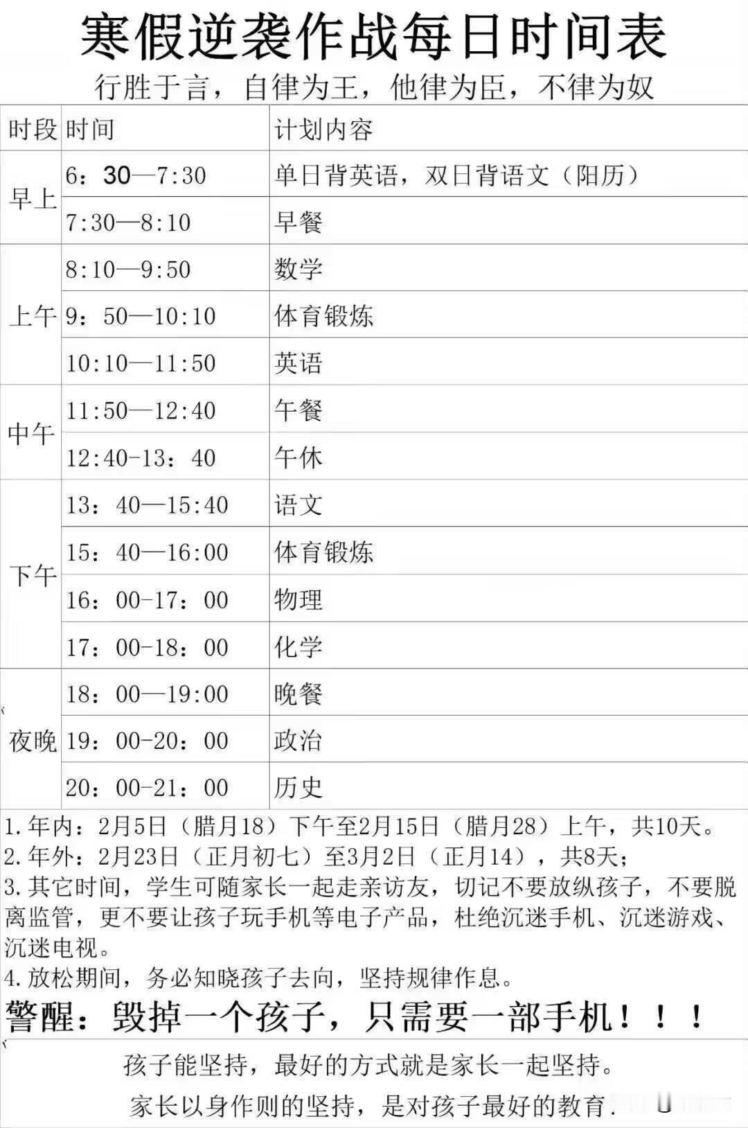 又到寒假了,家长们开始卷起来了!这是别人家孩子的寒假逆袭作战时间表! 每天从早上六点半开始,到晚上九点结束,行程安排的满满的! 还有时间表上的宣言:每日时间表行胜于言,自律为王! 毁掉一个孩子,只需要一部手机! 孩子能坚持,最好的方式就是家长一起坚持。 再看我们家孩子,心碎了一地! 早上睡懒觉,玩手机,玩手机,吃零食! 晚上熬夜玩游戏! 还是别人家孩子优秀啊!
