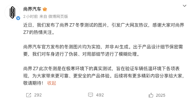 尚界发公告辟谣了!尚界Z7冬季测试时图片均为实拍,并非AI生成,而且还有博主现场实拍的视频证实,现在网络造谣确实太严重,你会发现热度高的车在网络上负面消息会很多!