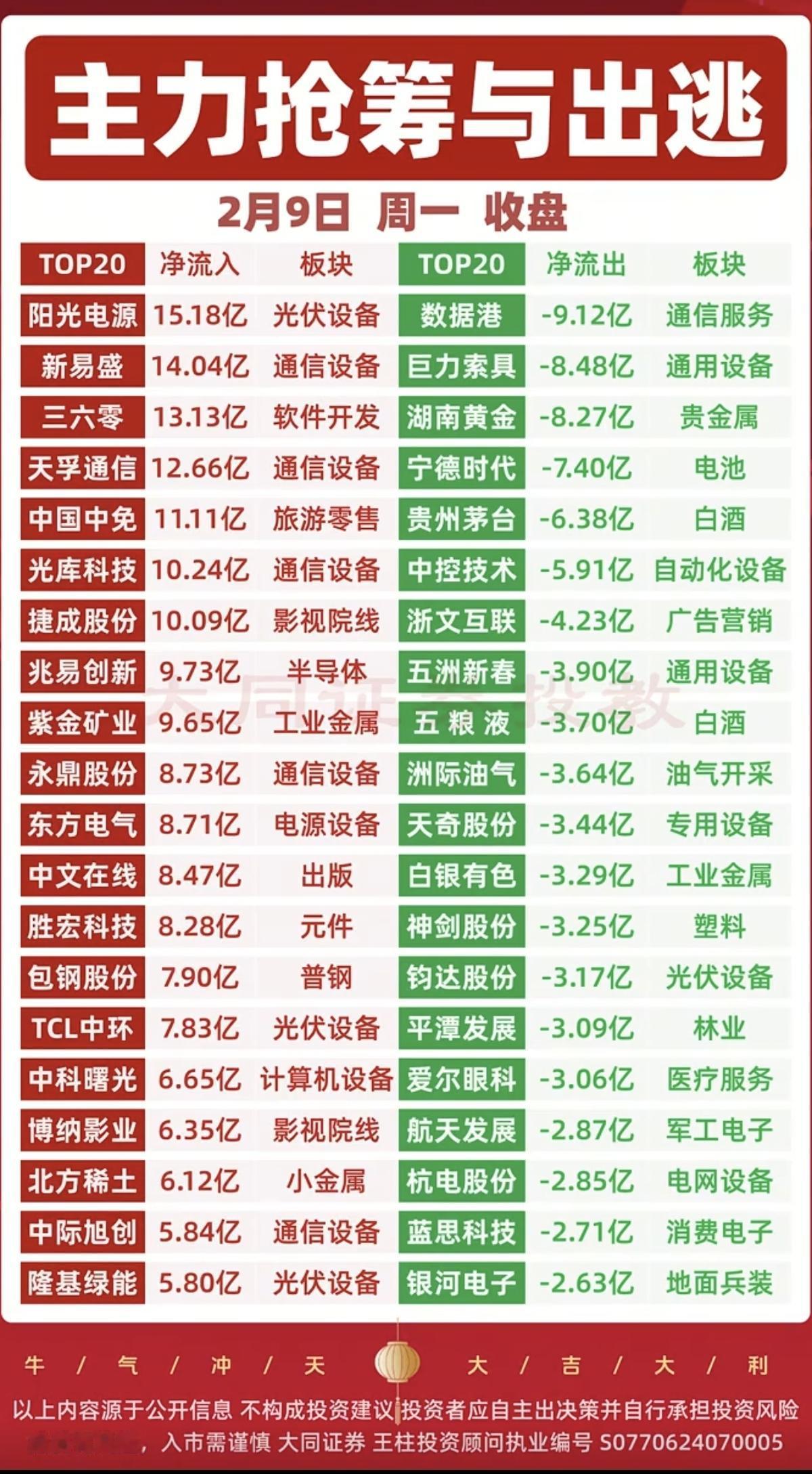 2.9周一 主力资金 抢筹出逃个股榜! 资金抢筹: 风电设备,光伏储能,人工智能AI、文化传媒,有色金属,数字水印,激光雷达,谷子经济等。 资金出逃: 退税商店,代糖概念,调味品,社区团购,新零售百货,网红经济相关等
