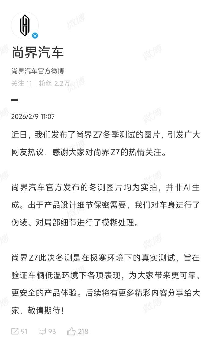 尚界Z7冬测有人怀疑是AI的,官方回应来了:均为实拍,非AI生成。背后的乌龙是,官方拍的是真的照片和视频,别人发的内容,被某短视频平台提醒是AI制作,大家就开始传是AI,这锅得谁去背?还是那句话,不传谣不信谣,AI技术现在很牛,注意甄别!【来自懂车帝车友圈】