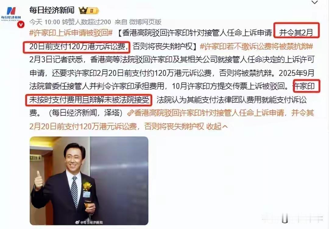 许家印能养顶级律师团,却赖120万讼费?香港高等法院法官欧阳浩荣的判词,面对许家印一方“没钱付讼费”的辩解,法官直言:能花重金聘请专业律师团队打诉讼,就绝对有能力支付120万港元讼费,这套“哭穷”把戏,在法治面前根本行不通! 法院直接下了最后通牒:2月20日前必须全额缴付讼费,逾期未付,将直接剥夺许家印在本案中的抗辩权!这意味着,一旦逾期,后续资产接管、债务清算等关键法律程序,他将彻底失去发言权,只能被动接受结果,连辩解的机会都没有。 许家印为了应对各类诉讼,长期聘请香港顶级资深大律师、专业律所团队,每月律师费都是天文数字,资金来源从未中断。一边是源源不断支付高额律师费,一边是拒不缴纳法院核定的讼费,就是蓄意藐视法庭、逃避法律责任。 曾经的地产巨头,如今连120万港元的讼费都要赖,看着是小钱博弈,是试图拖延债务清算、对抗司法程序的真实意图。但法治面前,没有特殊身份,更没有赖账特权。无论曾经多风光,只要藐视法庭、拒不履行判决,就必须承担相应后果。 逾期剥夺抗辩权,不是简单的罚钱,而是彻底切断其干扰司法程序的可能。这不仅是对许家印个人的惩戒,更是维护香港法治尊严、保障债权人合法权益的必然举措。 想靠“装穷”逃避责任?法律不答应!2月20日的最后期限,就是许家印为自己的赖账行为买单的时刻,任何蓄意对抗法治的行为,最终只会自食恶果!
