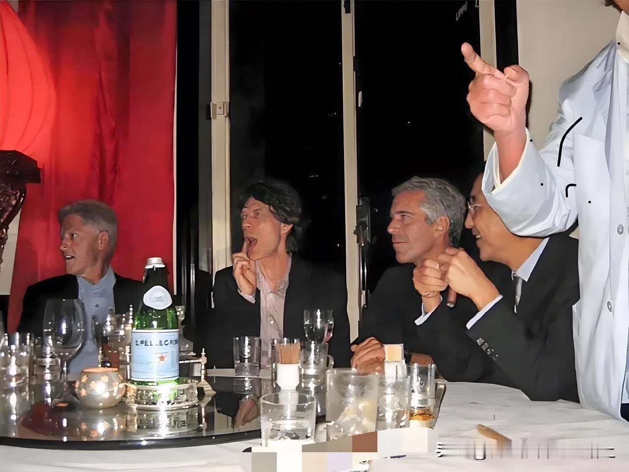 曝光的爱泼斯坦这张未标注日期的照片,照片中,从左到右依次为克林顿、摇滚明星米克・贾格尔、爱泼斯坦、??? 最右边的那人是谁?