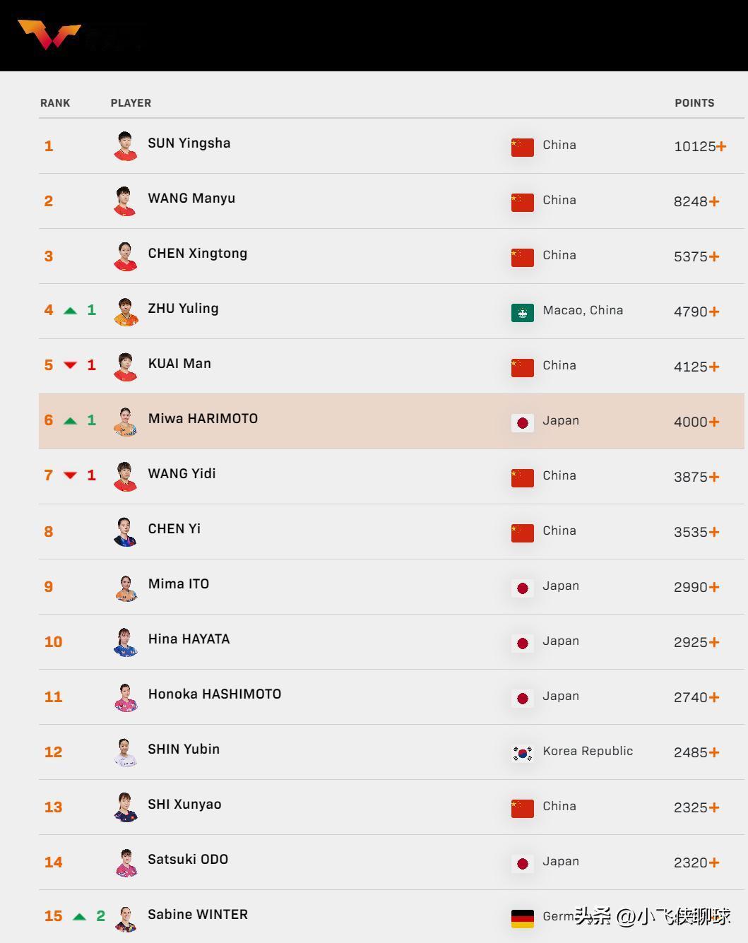 WTT女单最新世界排名更新:孙颖莎和王曼昱位列前二,中国球员包揽前五名。 1 孙颖莎,中国 10125分 2 王曼昱,中国 8248分 3 陈幸同,中国 5375分 4 朱雨玲,中国澳门 4790分 上升1位 5 蒯曼,中国 4125分 下降1位 6 张本美和,日本 4000分 上升1位 7 王艺迪,中国 3875分 下降1位 8 陈熠,中国 3535分 9 伊藤美诚,日本 2990分 10 早田希娜,日本 2925分 11 桥本帆乃香,日本 2740分 12 申裕斌,韩国 2485分 13 石洵瑶,中国 2325分 14 大藤沙月,日本 2320分 15 萨宾·温特,德国 2137分 上升2位 本次排名更新纳入亚洲杯成绩,亚洲杯冠亚军孙颖莎和王曼昱继续保持前2的排名。排名前10的运动员中,有7名来自中国,整体优势非常明显。 和男子排名区别较大的是,在女子排名前15名中主要以亚洲球员为主,中日韩三协会共占据14席位,其他协会,仅德国拿到一席。