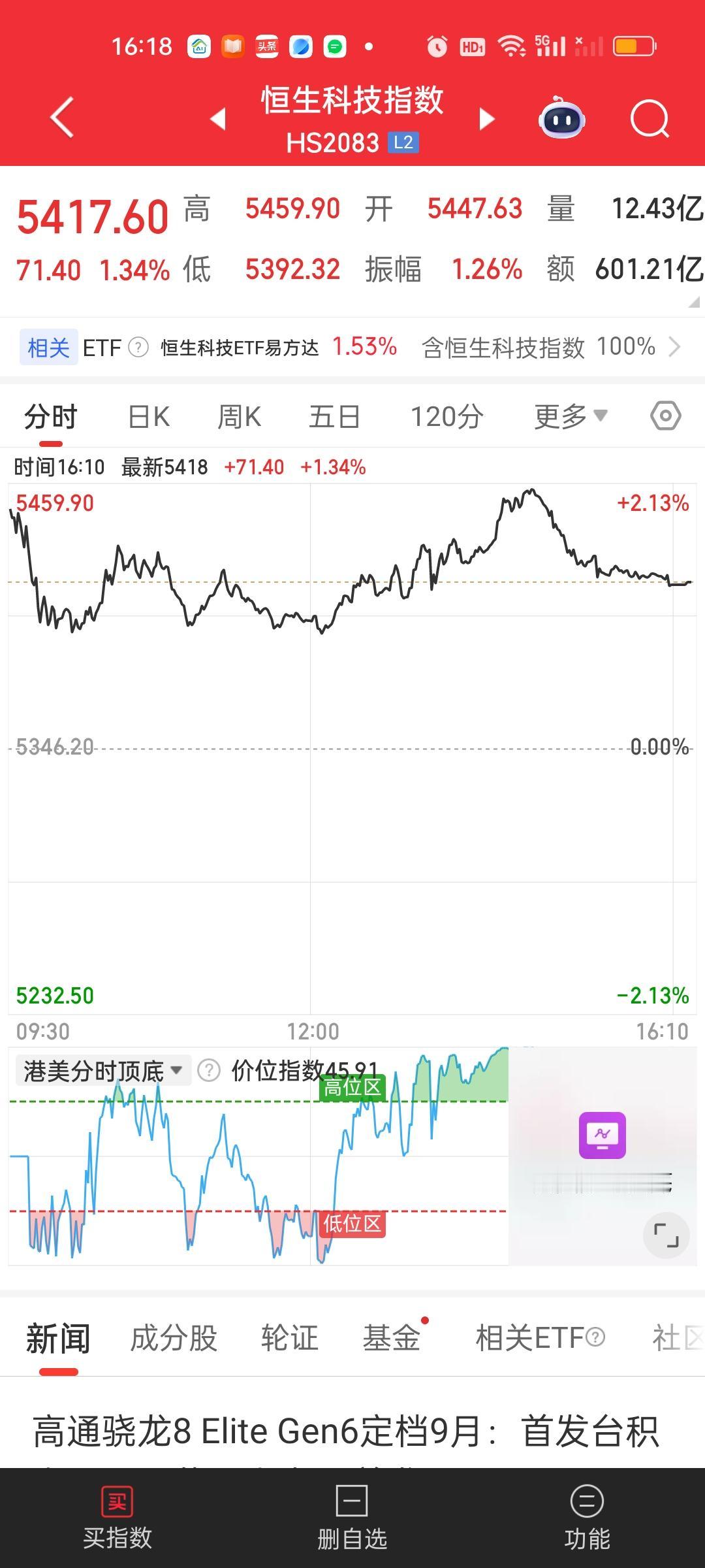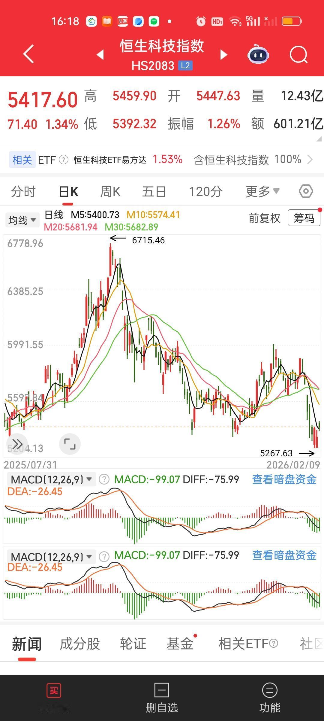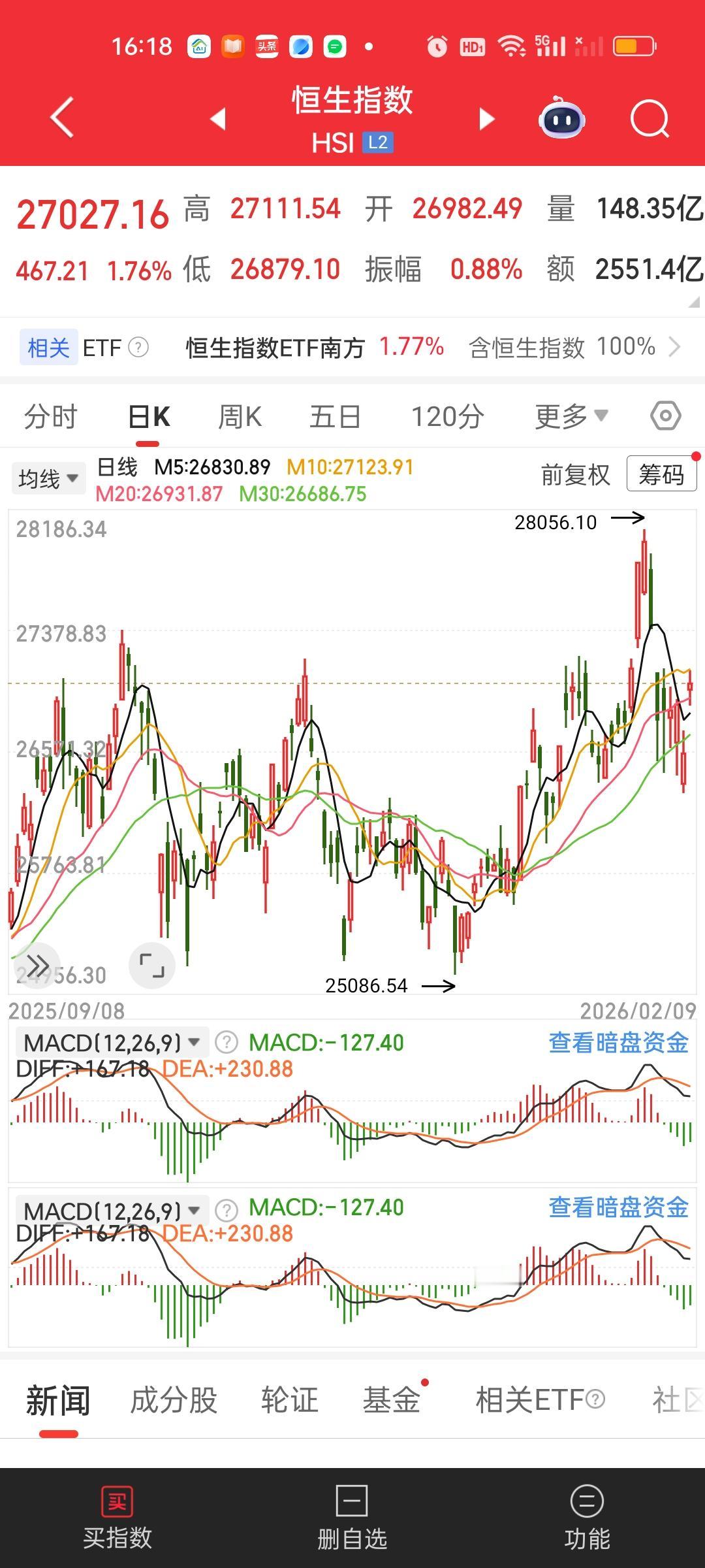 港股尾盘下跌了一些,恒指收盘依旧收在5日20日30日线上方,10日线下方,恒科依旧收在5日线上方,其它所有均线的下方,和中午收盘是一样的,从这个角度讲恒科要比恒指更加弱势。恒科这里要想站在全部均线的上方需要一根大阳线才可以。保持耐心就好!