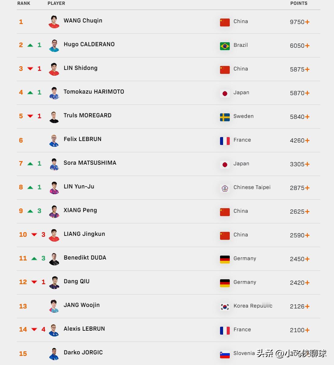 2月9日,WTT男单最新世界排名更新,中国队4人位列前10,亚洲杯冠军王楚钦稳坐第1。 1 王楚钦,中国,9750分 2 卡尔德拉诺,巴西,6050分,上升1 3 林诗栋,中国,5875分,下降1 4 张本智和,日本,5870分,上升1 5 莫雷加德,瑞典,5840分,下降1 6 F-勒布伦,法国,4260分 7 松岛辉空,日本,3305分,上升1 8 林昀儒,中国台北,2875分,上升1 9 向鹏,中国,2625分,上升3 10 梁靖崑,中国,2590分,下降3 11 杜达,德国,2450分,上升3 12 邱党,德国,2420分,下降1 13 张禹珍,韩国,2126分 14 A-勒布伦,法国,2100分,下降4 15 约奇克,斯洛文尼亚,2055分 在本期排名的前15运动员中,中国队共4人入选,其中王楚钦以9750分领跑,林诗栋第3,向鹏和梁靖崑分列第9和第10。 欧洲、日韩选手也不甘示弱,雨果、张本智和、莫雷加德稳居前列,各协会之间形成良性竞争局面。