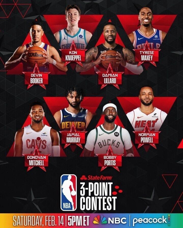 NBA官方宣布了全明星三分大赛参赛名单,赛季报销的利拉德惊喜入选,克尼佩尔成唯一新秀。具体名单如下: