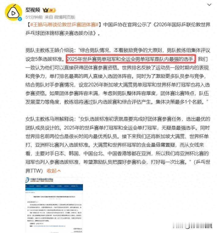 官宣!樊振东锁定世乒赛参赛资格,王皓解释,希望小胖不要退赛![送心] 中国乒协于2月3日正式公布了伦敦世乒赛团体赛的选拔办法,其中最引人注目的消息无疑是樊振东的入选。这位前世界第一凭借第十五届全国运动会男单冠军的身份,直接锁定了一个宝贵的参赛席位。 尽管他已超过一年未出现在国际乒联的世界排名榜单中,但国乒通过这一选拔通道,明确传递了对这位核心球员的信任与期待。   本次世乒赛团体赛将于4月28日至5月10日在伦敦举行。国乒男队的选拔机制设计了多重通道,确保将状态最佳的选手纳入阵容。 已确定的名额包括,2025年多哈世乒赛男单冠军王楚钦、十五运会男单冠军樊振东。此外,以2026年2月9日公布的世界排名为依据,位列国乒前两位的选手也将直接入围。   若以上途径产生的名额未满五人,后续赛事冠军将成为关键。即将举行的澳门世界杯男单冠军,以及新加坡大满贯赛的男单冠军,都能凭此直通伦敦。如果最终仍有空缺,剩余名额将通过队内选拔赛产生,并由教练组进行综合评估,其中教练组评估确定的名额不超过一个。 女队的选拔框架与男队类似,但存在细微而重要的差别。在主力选拔通道之外,特别设立了“亚洲杯通道”,若名额未满,2026年亚洲杯女单冠军将直接获得资格。这一设计被认为更具针对性,旨在让队员提前与亚洲主要对手交锋,进行实战演练。   目前,女队中已确保席位的是孙颖莎和王曼昱。而陈梦、王艺迪、蒯曼等一众高手,势必将在接下来的亚洲杯、世界杯等赛事中展开激烈角逐,竞争余下的位置。男队方面,王楚钦和樊振东已手握门票,林诗栋能否凭借世界排名即时入围,还需等待2月9日的榜单揭晓。 樊振东的回归无疑是本次名单的最大看点,自去年淡出国际赛场后,他主要在德国乒乓球联赛中保持比赛感觉。通过全运会冠军这一国内最高水平赛事的证明,他绕开了世界排名的限制,顺利重返国家队核心战阵。 男队主教练王皓在解读规则时强调,选拔办法遵循“竞争择优、选用公廉”的原则,世乒赛单打冠军和全运会冠军作为至高荣誉,其获得者直接入围是公平合理的体现。这并非为某一位球员特设的“绿色通道”,而是基于大赛成绩的硬性标准。 对于广大球迷而言,能在伦敦看到樊振东重新身披国袍出战,无疑是一份惊喜。他的技术实力与大赛经验,始终是中国男乒不可或缺的财富。这次世锦赛将成为检验他近期状态、并重新融入团队节奏的关键一役。 从巴黎到洛杉矶,国乒的新周期征程已经启幕。樊振东的归来,为男队阵容增添了更多的可能性和厚度。他的表现,不仅关乎本次世锦赛的卫冕之路,也将影响着未来两年奥运资格的竞争格局。 看到樊振东以这种方式强势回归国家队,你是否感到意外?你认为久疏国际战阵的他,能在伦敦迅速找回顶级对抗的状态吗?欢迎在评论区分享你的期待与预测!