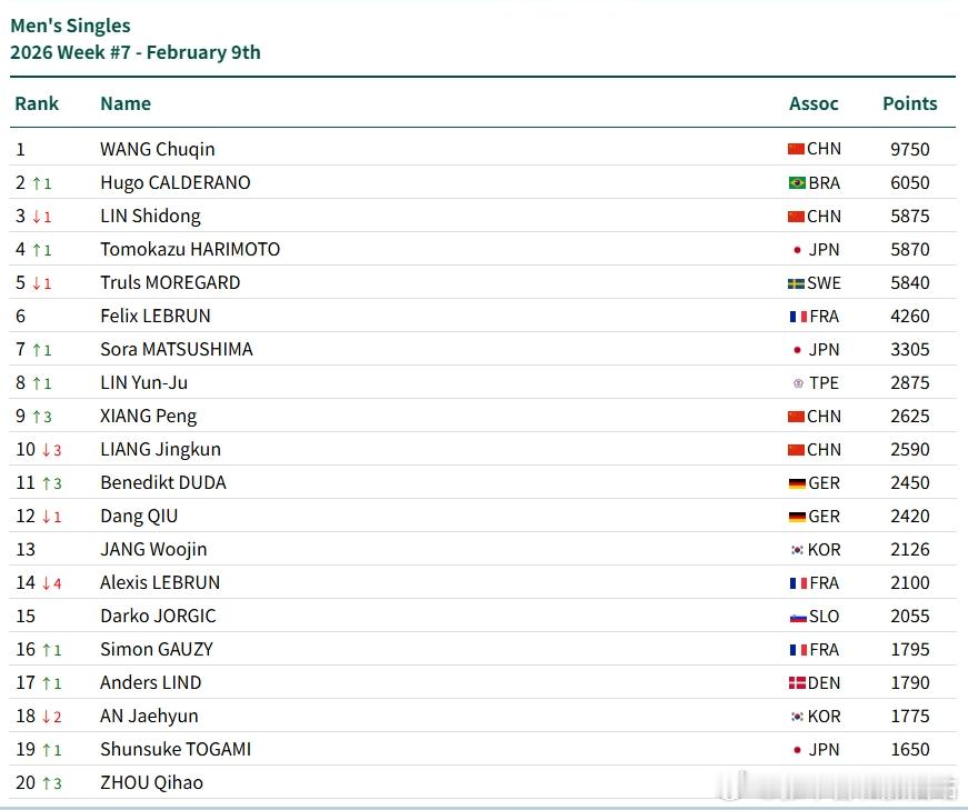 原世排第2林诗栋本周清掉25新加坡大满贯冠军2000分, 积分降至5875排名第3。世排2-5位积分差距极小,2位 雨果 6050分,最低有效分350;3位 林诗栋 5875分,最低有效分350;4位 张本智和 5870分,最低有效分350;5位 莫雷高德 5840分,最低有效分175。下一场大赛为26新加坡大满贯,16强380分,8强580分。这几位只要进入16强,积分就会发生变动,预计新满的竞争将非常激烈。