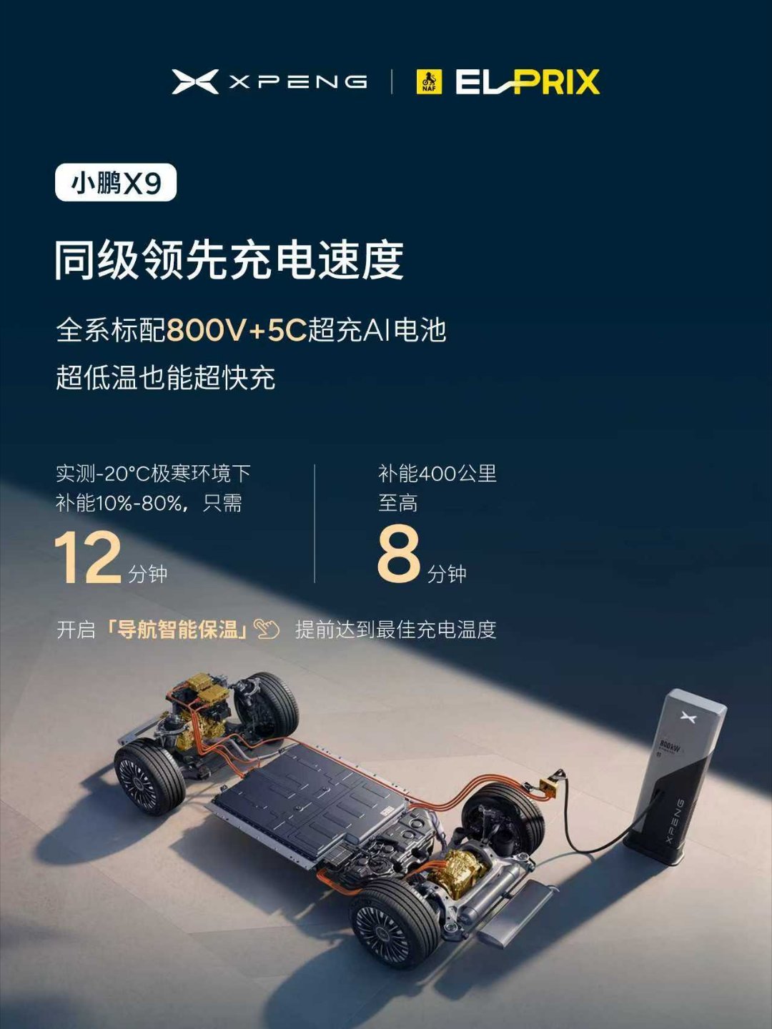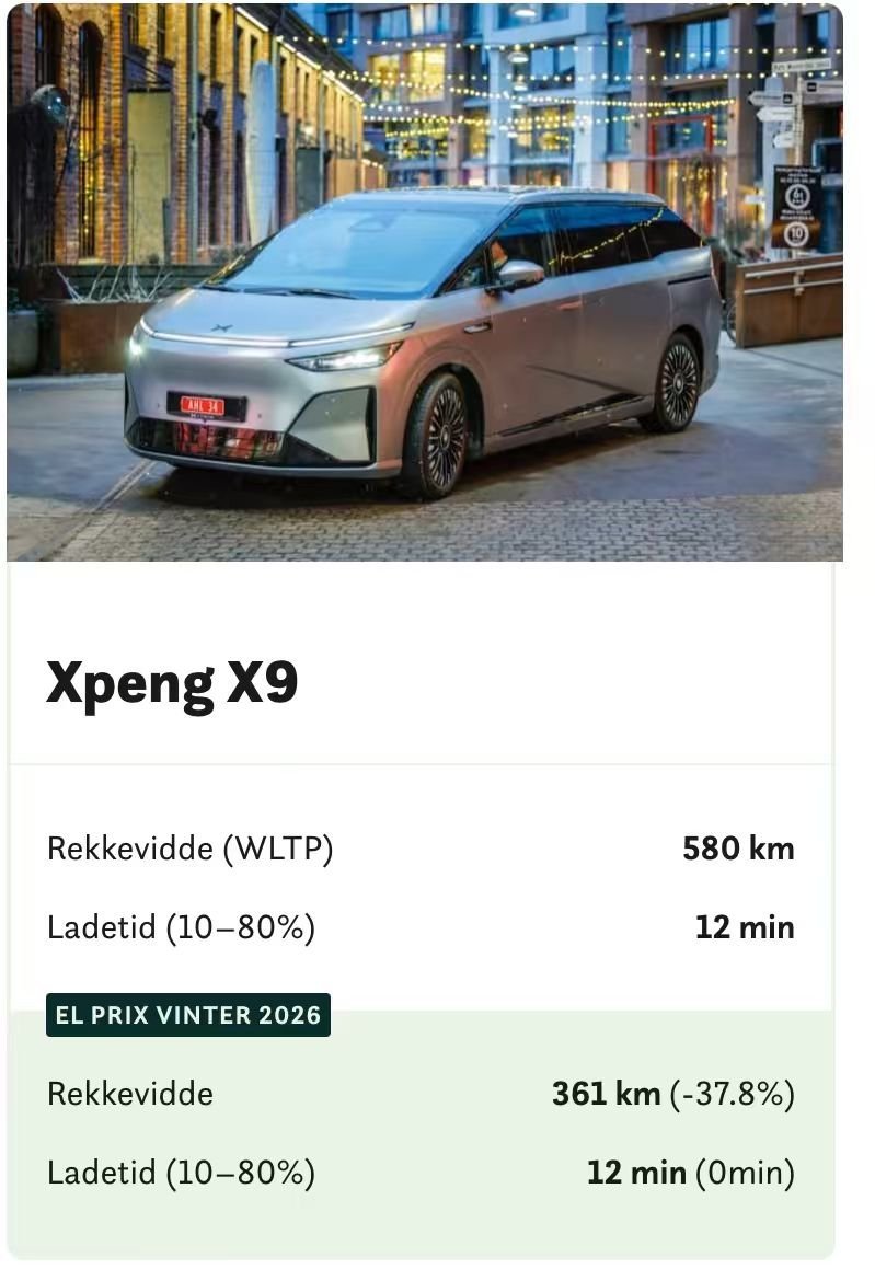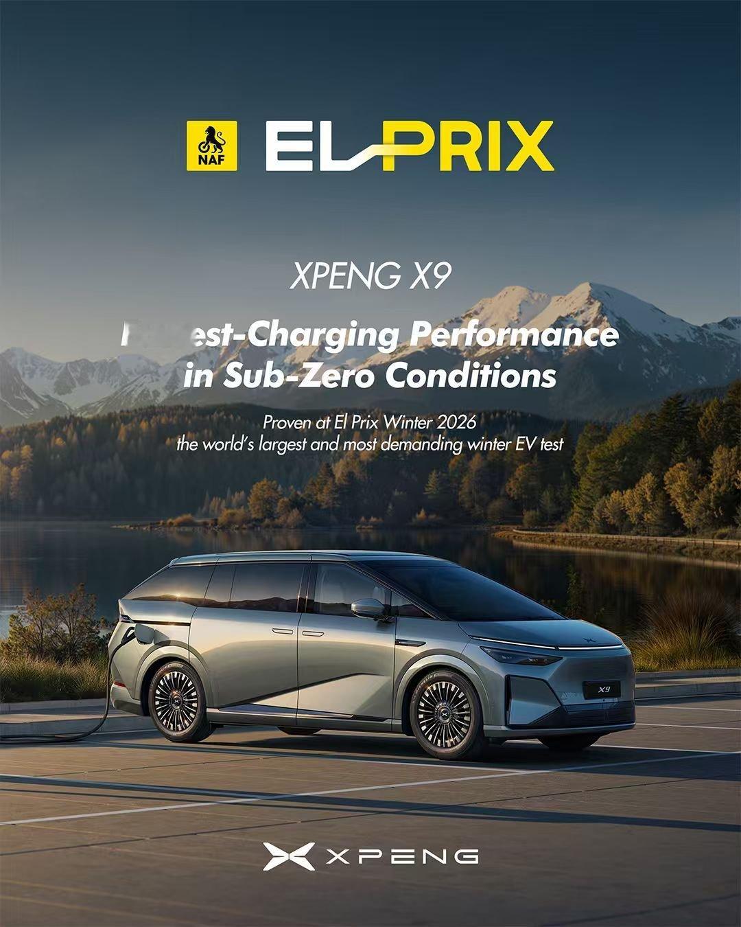 在「2026挪威NAF El  Prix冬季测试」这项全球规模最大、挑战最严峻的冬季电动车测试中,于-20℃极寒下,小鹏X9实现12分钟即从10%充至80%,性能全程在线无衰减,实力领跑。
