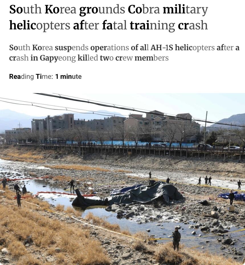 外媒:2月9日,韩国一架AH-1S“眼镜蛇”直升机在首尔西部的高阳郡训练时坠毁,机上两名机组人员在送往医院后被宣布死亡。 事故发生后,韩国军方暂停了所有同型号直升机的飞行任务,以调查事故原因。该直升机当时正在进行紧急着陆训练,失事原因尚未确定。 AH-1S“眼镜蛇”是一款美国制造的单发反坦克攻击直升机,此次坠机事件引发了韩国军方对老式军用直升机安全性的关注。