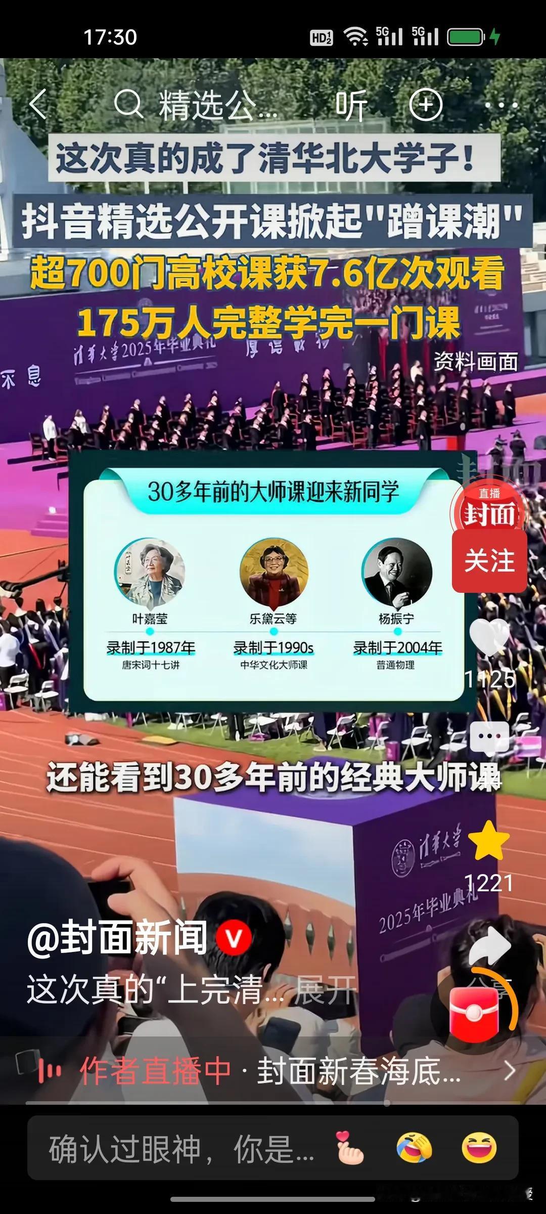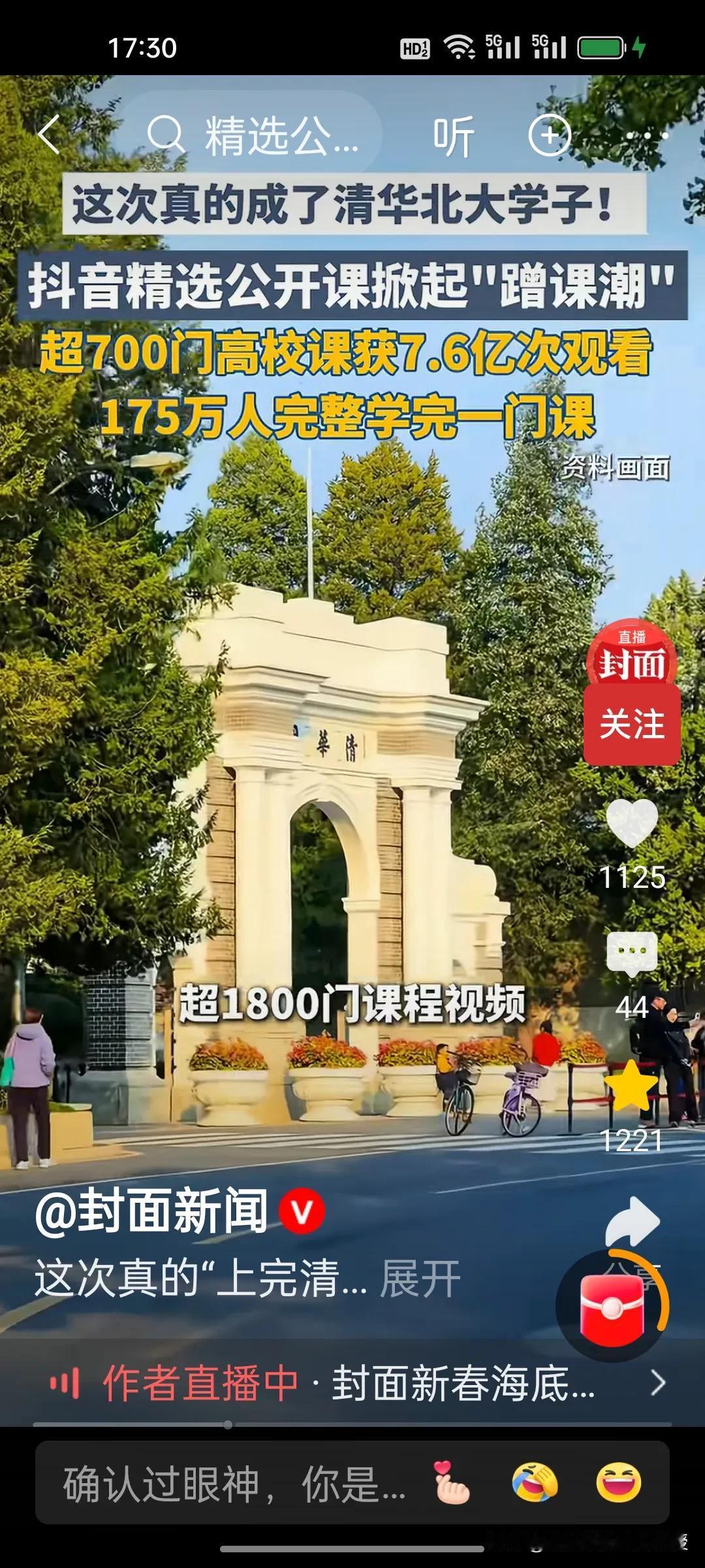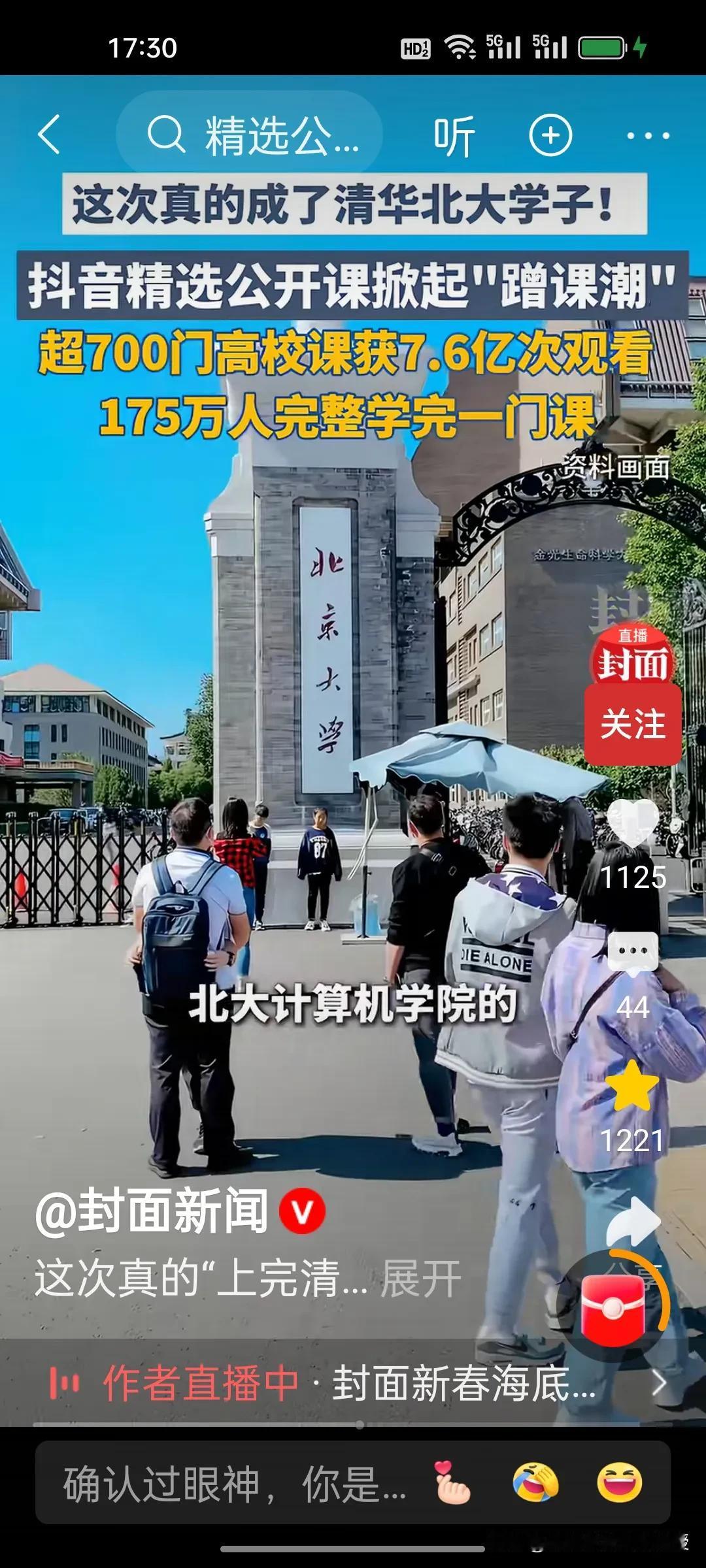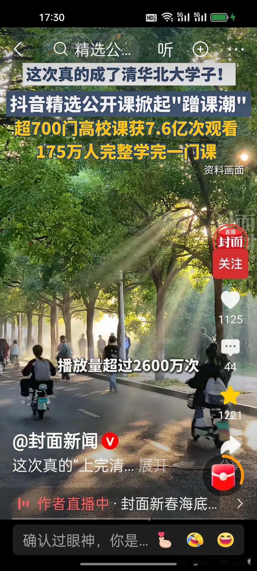 清北敞开校门,这才是大学该有的样子!刚刚看到香港城市大学校长接受《人民日报》专访,他的一句“高校要敞开大门办学”,点破了中国高等教育的新趋势。当1800门抖音精选公开课让1.45亿人蹭上清北课程,我们终于明白:优质教育不该是象牙塔里的私藏。 国外顶尖大学早已把公开课做成全球共享的知识盛宴,而清北等名校通过短视频平台开放课程,正是在跟上这个步伐。7.6亿次观看、175万人完整学完一门课,这些数字证明,当大学放下门槛,知识就能成为照亮更多人的光。 教育的本质是传递,不是垄断。你支持更多高校敞开大门吗?冬日生活打卡季