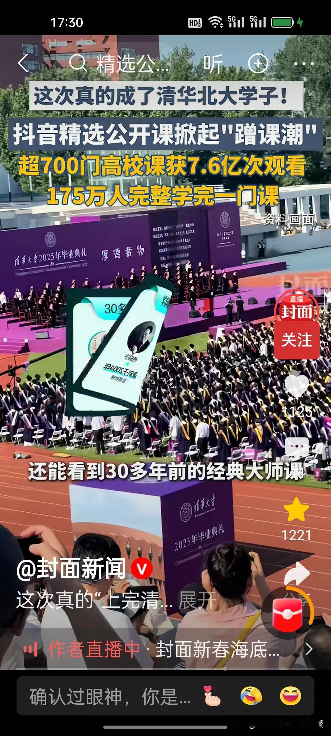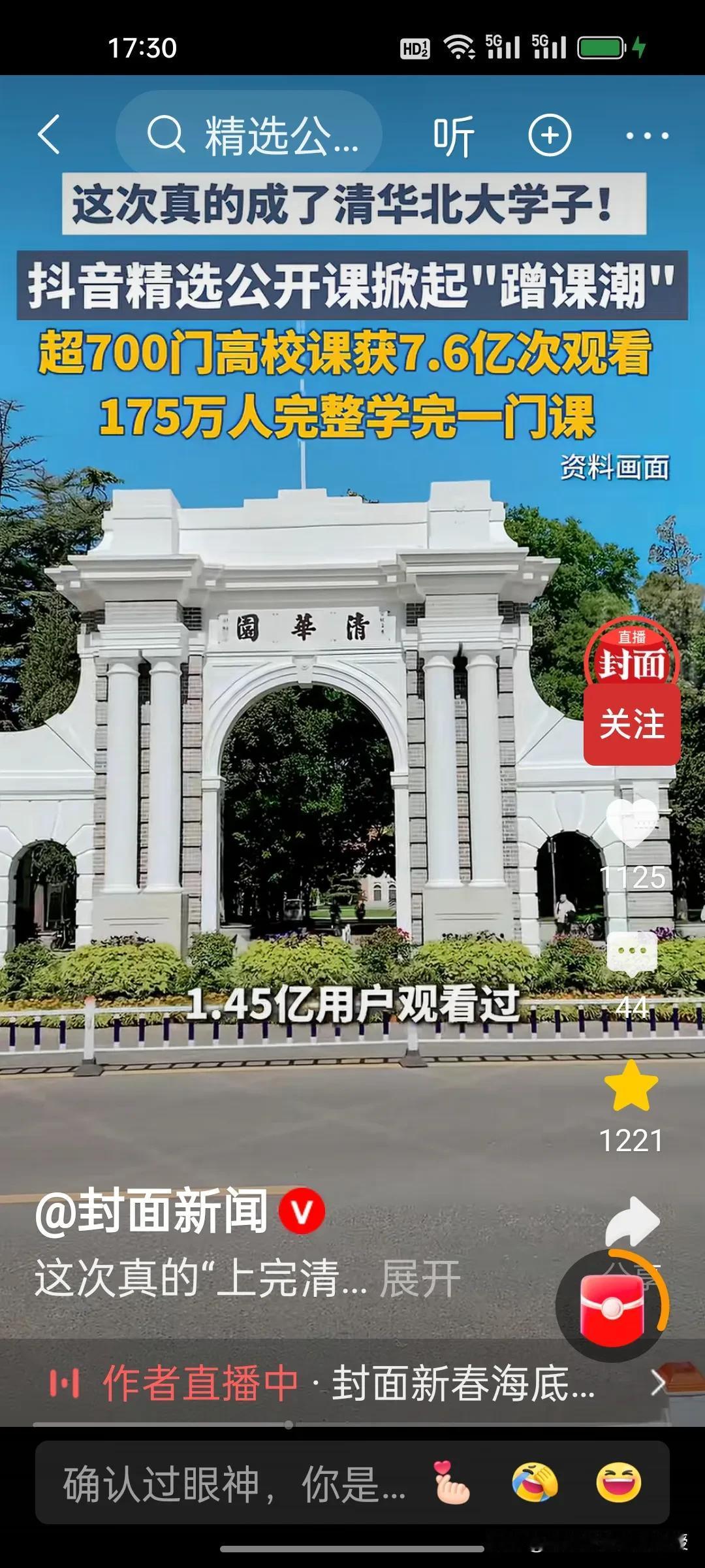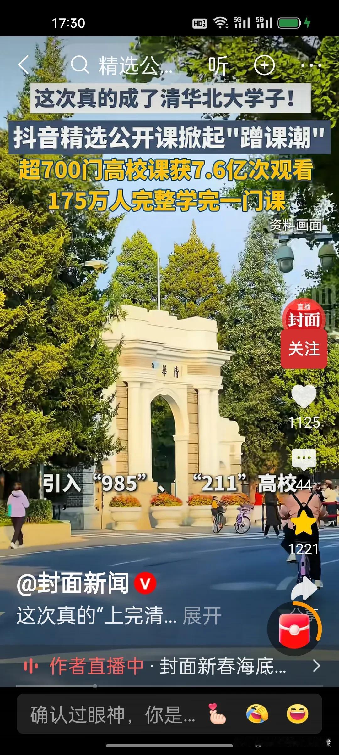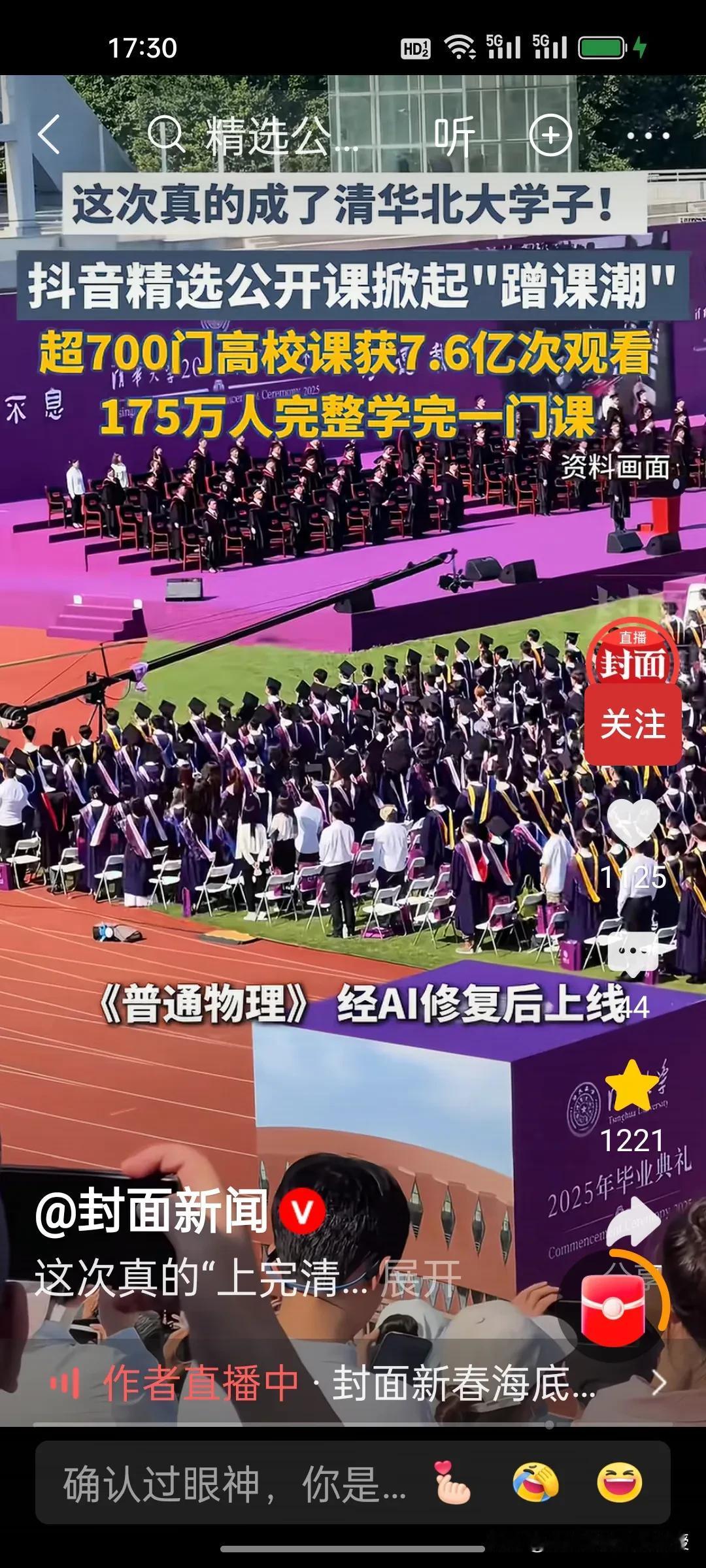 清北敞开校门,这才是大学该有的样子!刚刚看到香港城市大学校长接受《人民日报》专访,他的一句“高校要敞开大门办学”,点破了中国高等教育的新趋势。当1800门抖音精选公开课让1.45亿人蹭上清北课程,我们终于明白:优质教育不该是象牙塔里的私藏。 国外顶尖大学早已把公开课做成全球共享的知识盛宴,而清北等名校通过短视频平台开放课程,正是在跟上这个步伐。7.6亿次观看、175万人完整学完一门课,这些数字证明,当大学放下门槛,知识就能成为照亮更多人的光。 教育的本质是传递,不是垄断。你支持更多高校敞开大门吗?冬日生活打卡季