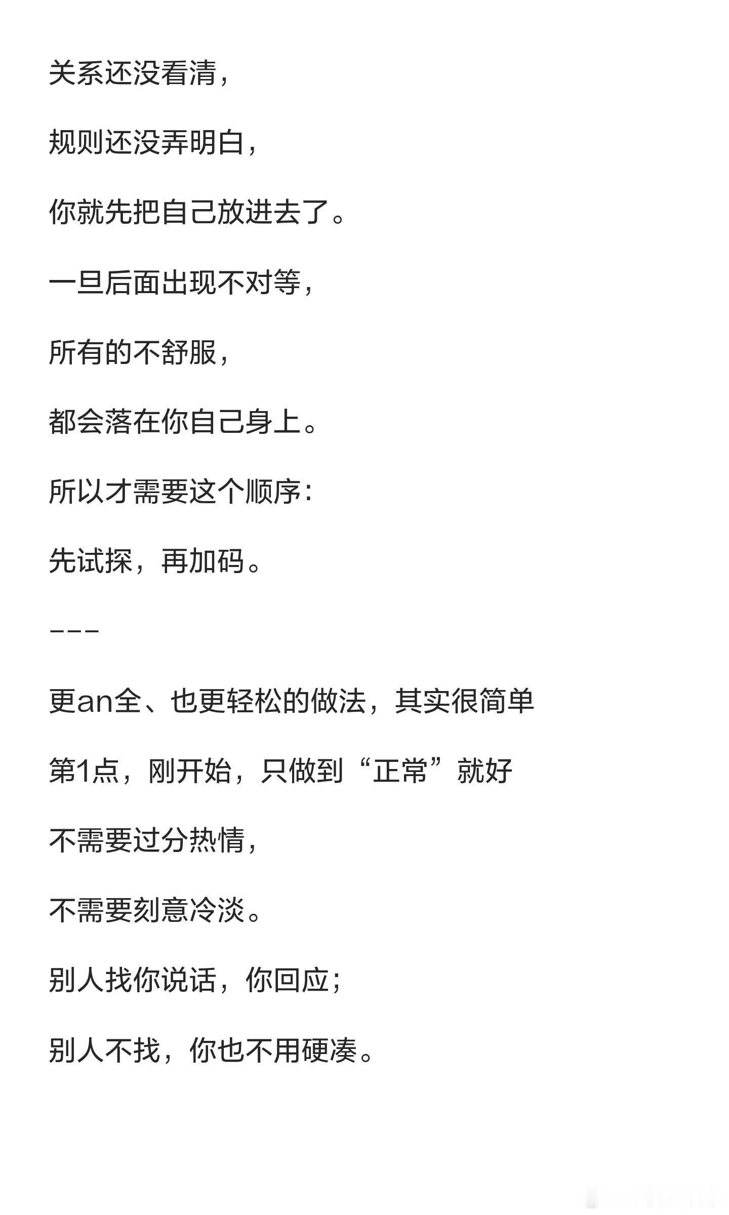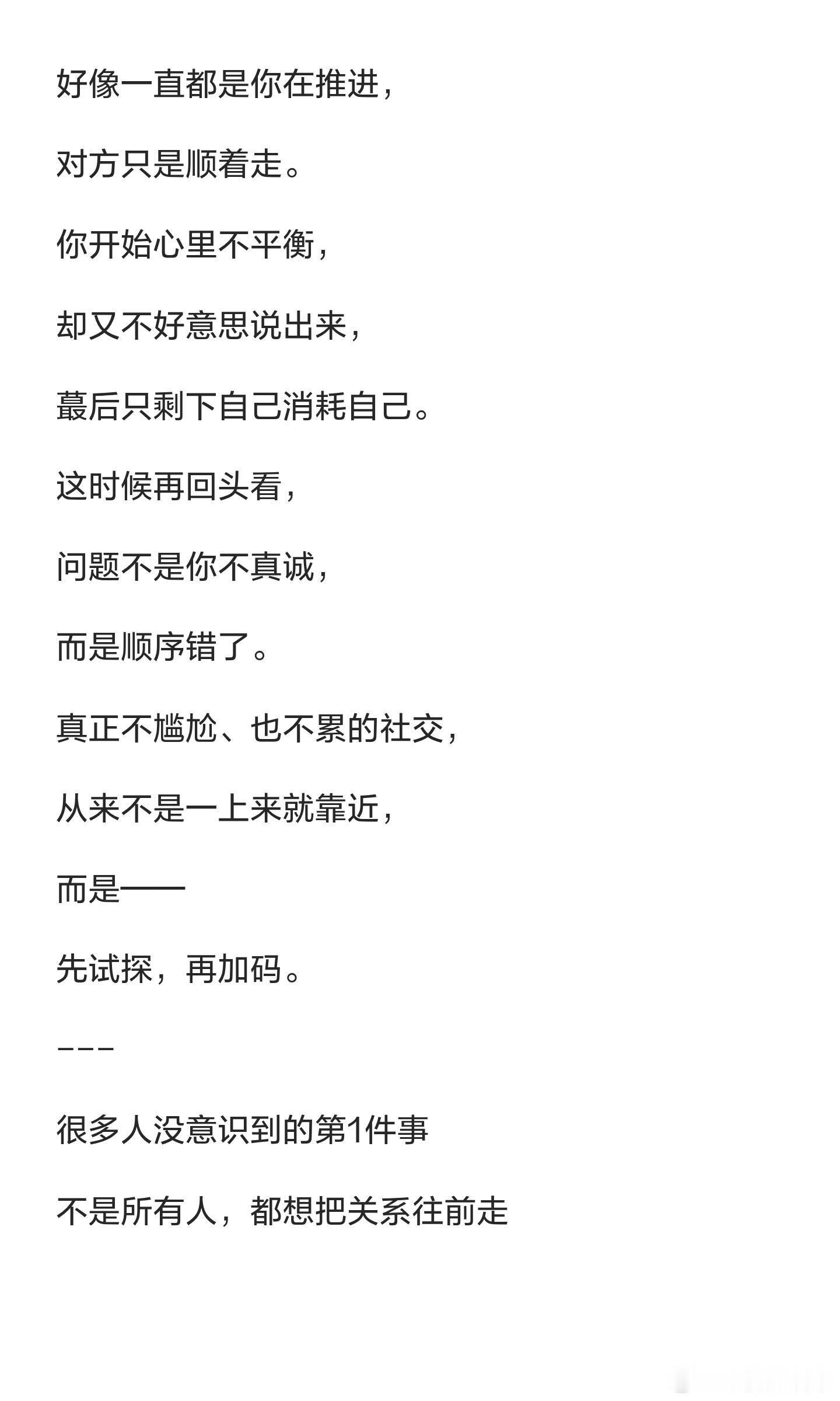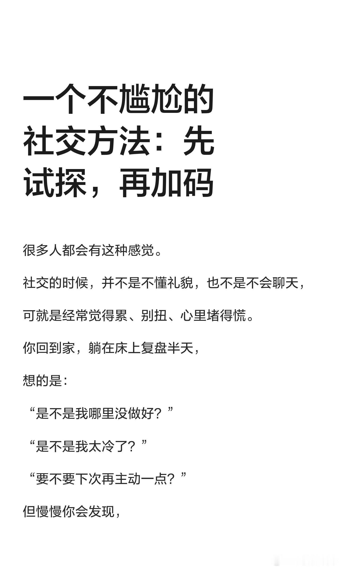 这个加码方式太香了一个不尴尬的社交方法:先试探,再加码社交中,急于投入反而让人感到累和别扭。真正的社交是先试探再加码,确认关系的双向性。试探不是冷淡,而是稳重;加码不是讨好,而是确认值得。学会先看清再投入,关系会更轻松。