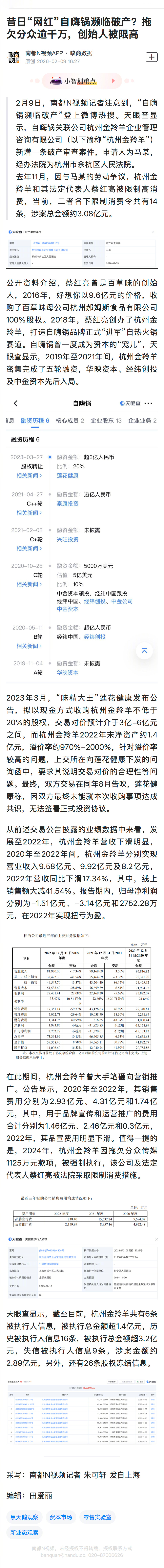 #昔日网红自嗨锅拖欠分众传媒超千万#【昔日“网红”自嗨锅濒临破产?拖欠分众逾千万,创始人被限高】 #自嗨锅创始人被限制高消费#天眼查显示,自嗨锅关联公司杭州金羚羊企业管理咨询有限公司新增一条破产审查案件。该公司及法定代表人蔡红亮目前共有14条限制消费令,涉案总金额约3.08亿元。值得一提的是,2024年,杭州金羚羊因拖欠分众传媒1125万元款项,被强制执行,该公司及法定代表人蔡红亮被法院采取限制消费措施。天眼查显示,截至目前,杭州金羚羊共有6条被执行人信息,被执行总金额超1.4亿元,历史被执行人信息16条,被执行总金额超3.2亿元,失信被执行人信息9条,涉案金额约2.89亿元,另外,还有26条股权冻结信息。公开资料显示,蔡红亮曾是百草味创始人,2018年创办杭州金羚羊打造自嗨锅品牌。2019-2021年间公司完成五轮融资,华映资本、经纬创投及中金资本先后入局。但2022年营收同比下滑17.34%,线上销售额大减41.54%。南都N视频记者 朱可轩 发自上海